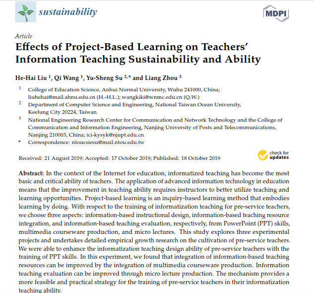 刘和海,王琪,苏育生:Effects of Project-Based Learning on Teachers’Information Teaching Sustainability and Ability