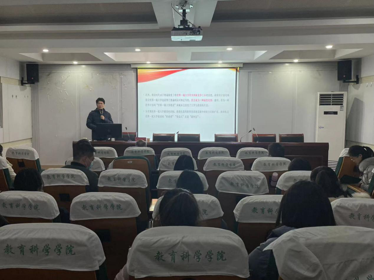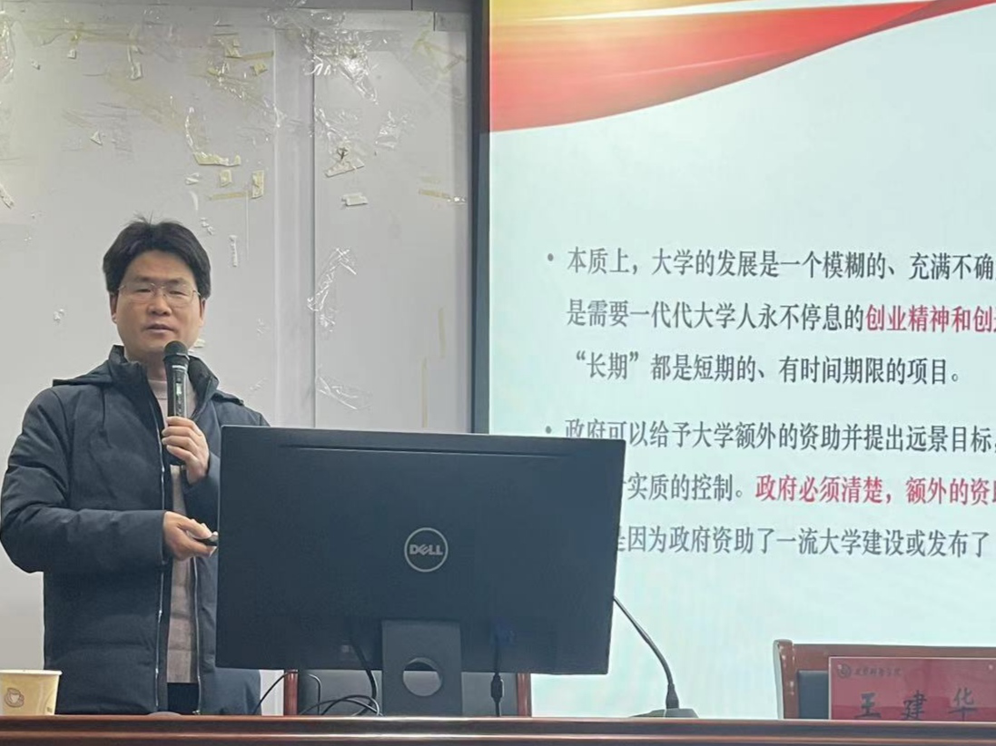 本网讯(教科院 文/何亮 图/王薛晴)1月12日下午,南京金年会博士生导师王建华教授应邀来我院作“教育计划、量化评估与一流大学”的主题讲座。本次讲座于教育科学学院三楼学术交流中心举行,由我院院长李宜江教授和我院金维才教授主持,高等教育学、教育学原理和课程与教学论等专业老师及研究生到场聆听学习。
