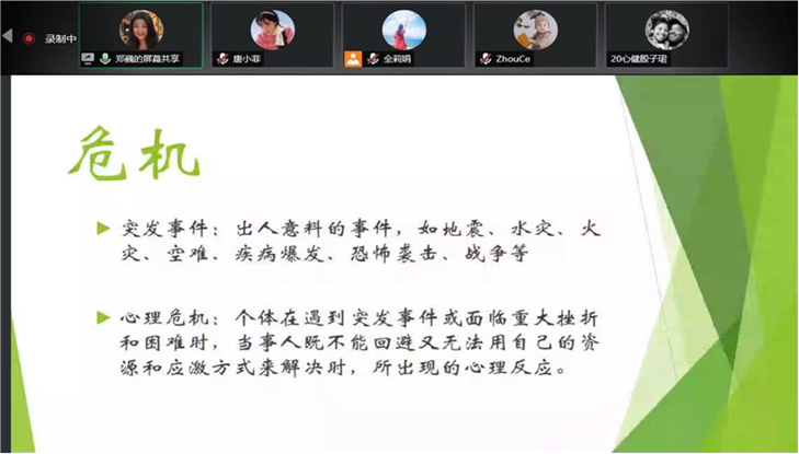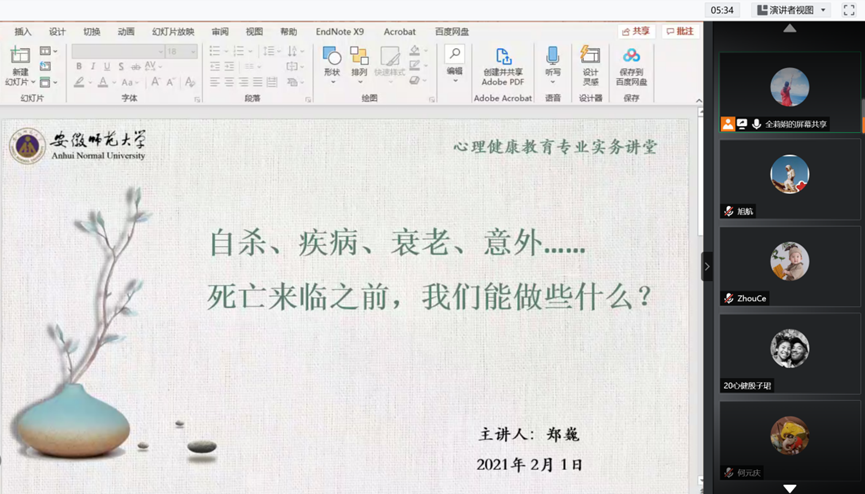 本网讯(教科院 文/杨霄楠 图/唐小菲)为拓宽心理学研究生学术视野,提升实务操作能力。2月1日下午,上海市众成心理资深心理咨询师郑巍应邀为我院师生作以“自杀、疾病、衰老、意外……死亡来临之前,我们能做些什么”为主题的心理健康教育专业硕士实务讲座。本次报告依托腾讯会议平台进行,由我院心理健康教育专业学位硕士点负责人全莉娟副教授主持,心理学与心理健康教育专业师生共计80余名参会学习。
