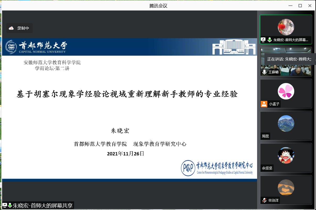 本网讯(文/谢伟燕 图/李琴)11月26日上午,首都师范大学教育学院副院长、学校德育研究院院长朱晓宏教授受邀学院“学而论坛”第二讲,作“基于胡塞尔现象学视域重新理解新手教师的专业经验”主题讲座。本次讲座通过腾讯会议线上举行,由学院博士生导师周兴国教授主持,教育学相关专业教师、博士及硕士研究生在三楼学术交流中心线上聆听。