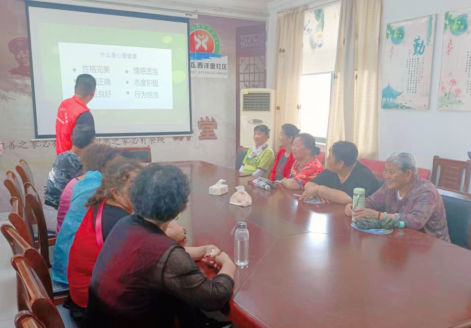 6月27日,盛纪元、强和、洪欣怡、周杨、李强五位团队成员在西洋里社区居民委员会为十位老人进行心理健康安全知识讲座。活动中,强和同学结合文字、图片及视频等丰富的形式向老人们讲述心理健康的内涵、如何保持心理健康等,引导他们学会直面心理衰老。伴随着社会的快速发展,老人们不仅需要提高身体保障,也需要调整心态的方式方法,从而明确自身定位和认识自我价值。