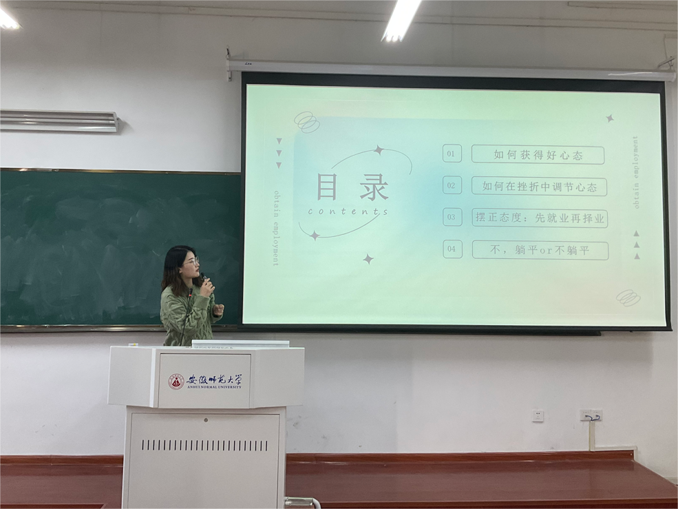 聂余就招聘程序、选聘条件、就业准备三方面展开,明确介绍了就业渠道、就业必须材料及就业加分项目。她指出,各位同学应及早进行就业规划,多参与教育实习工作和心理相关活动,积累相关实习经历,提高自身的就业技能。赵慧宇认为求职应做到知己知彼,了解自身,掌握职业需求,且求职成功需要良好的心态,先就业再择业,在工作中积累经验,在失败中找到不足。李梦圆就自身求职和备考经历作为实际案例进行分析,她鼓励各同学在校期间明确发展方向,夯实求职技能、丰富求职材料,做好求职的心理准备和技能准备。分享结束后,同学们踊跃提问,嘉宾耐心作答,现场气氛热烈。