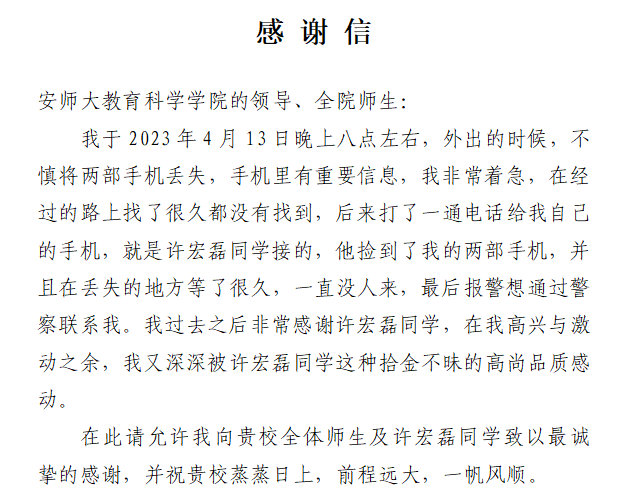 近日,教育科学学院团委收到一份匿名感谢信,对学院2021级学前教育专业本科生许宏磊同学拾金不昧事件表达了感谢。