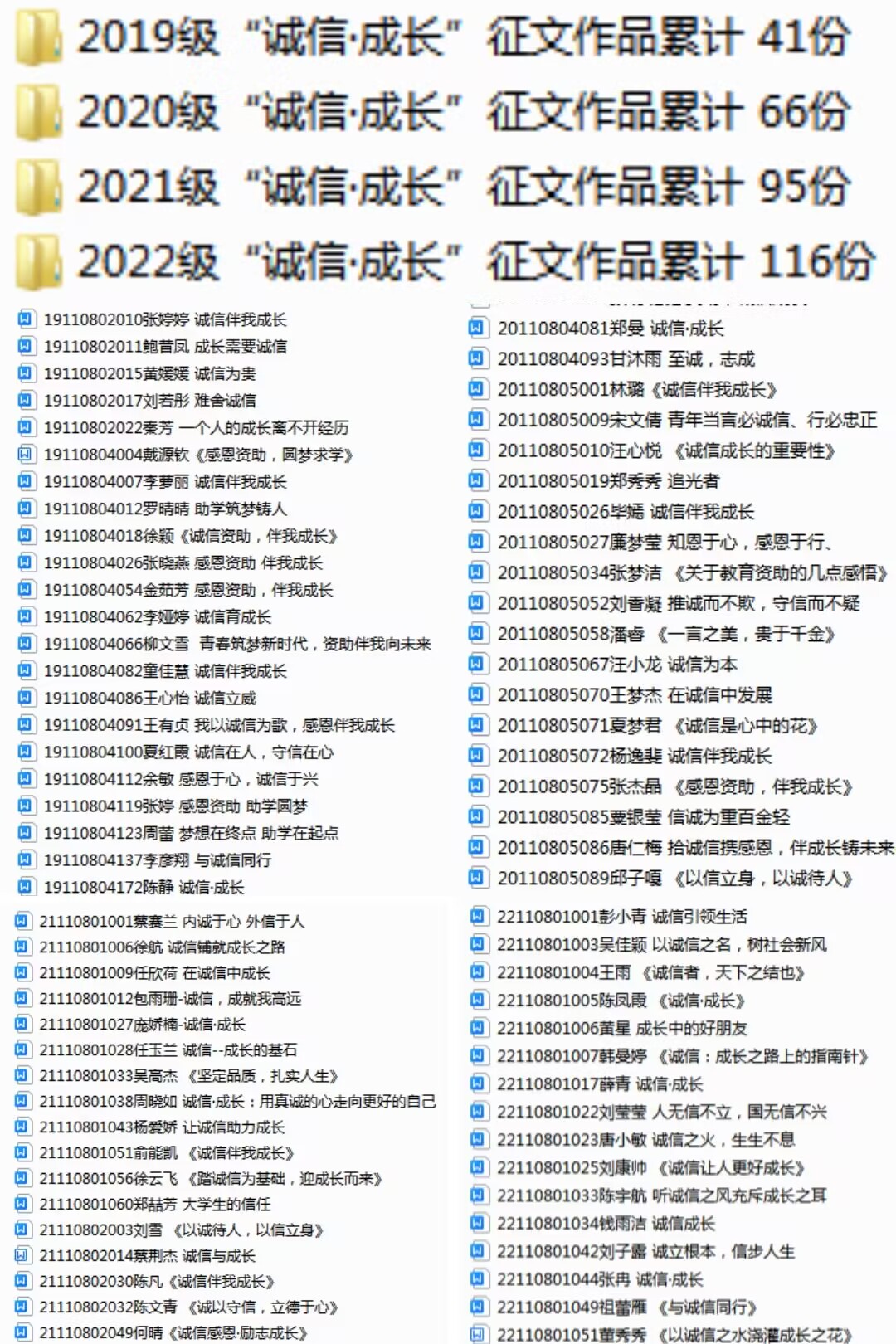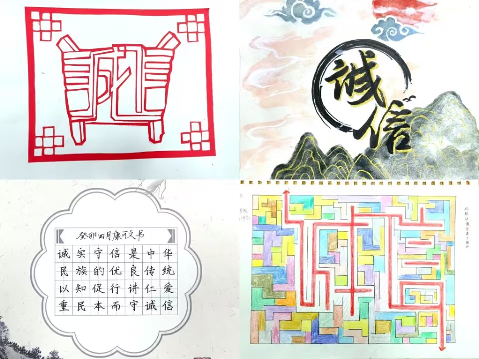 通过诚信主题作品创作,让学生的诚信理念内化于心、外化于行。学院鼓励各年级学生采用文稿、书法、绘画、剪纸、篆刻、微视频等丰富形式开展诚信主题作品创作,引导学生践行“讲仁爱、重民本、守诚信”的价值理念。面向家庭经济困难学生群体举办“诚信˙成长”主题征文活动,累计收集征文作品318份,进一步推动学院资助工作实现“扶智”与“扶志”的紧密结合,助力贫困学子努力奋进、恪守诚信、心怀感恩。