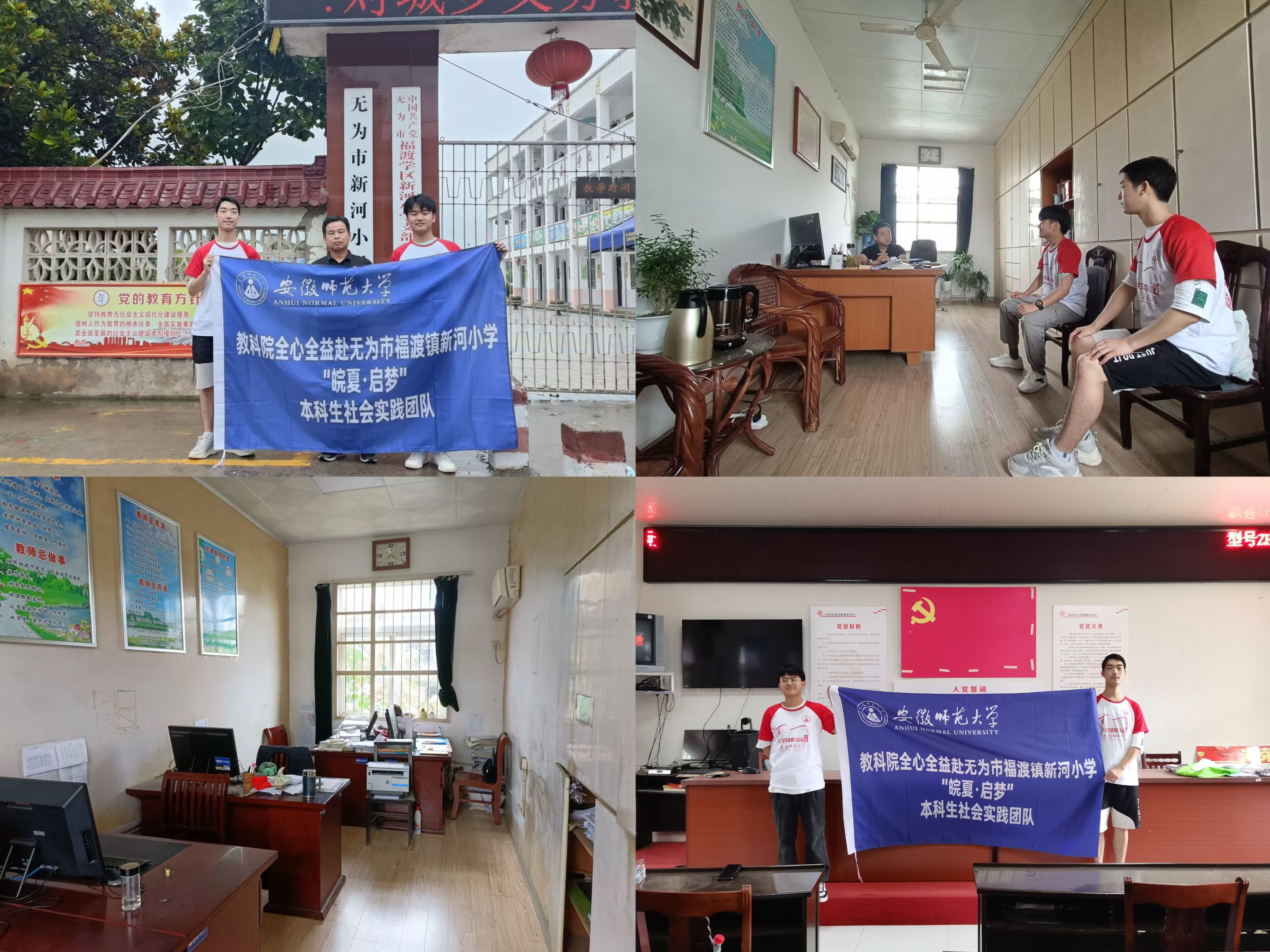 6月30日,团队骨干成员于队伍启程前夕赴无为市福渡镇新河小学考察实践地,主要就熟悉周边环境、对接村党支部社区、对接小学实践地三方面展开。团队成员考察了附件的超市、便利店等,为队员提供后勤保障;对接了社区党支部书记,便于后期红色宣讲的开展;熟悉学校相关场所和设备,为顺利开展爱心支教奠定基础。