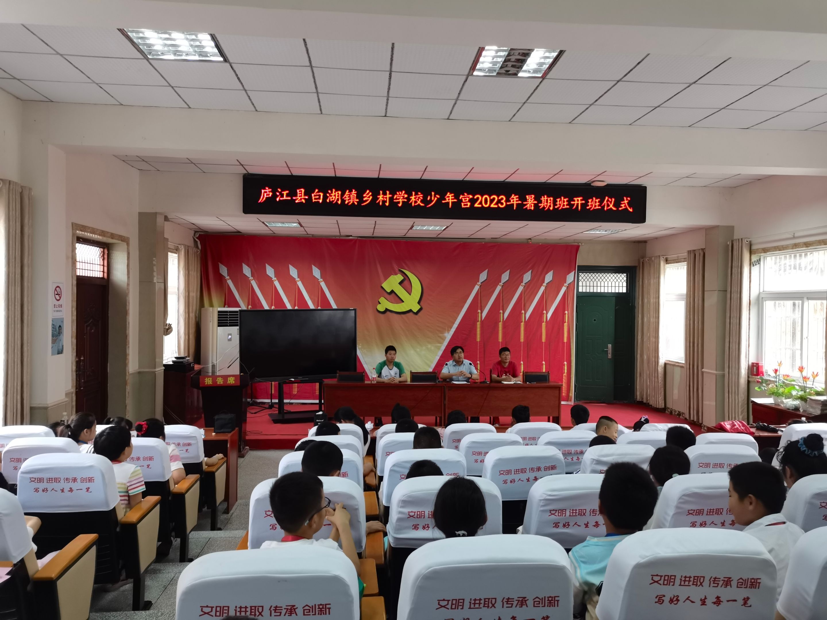 7月7日上午,教育科学学院“全心全益”赴庐江县白湖镇本科生社会实践团队出征仪式暨庐江县白湖镇乡村学校少年宫2023年暑期班开班仪式正式召开。白湖镇中心小学校长柏加云、白湖镇中心小学副校长范昌社会实践团队全体成员与2023年暑期少年宫全体学员参与本次活动