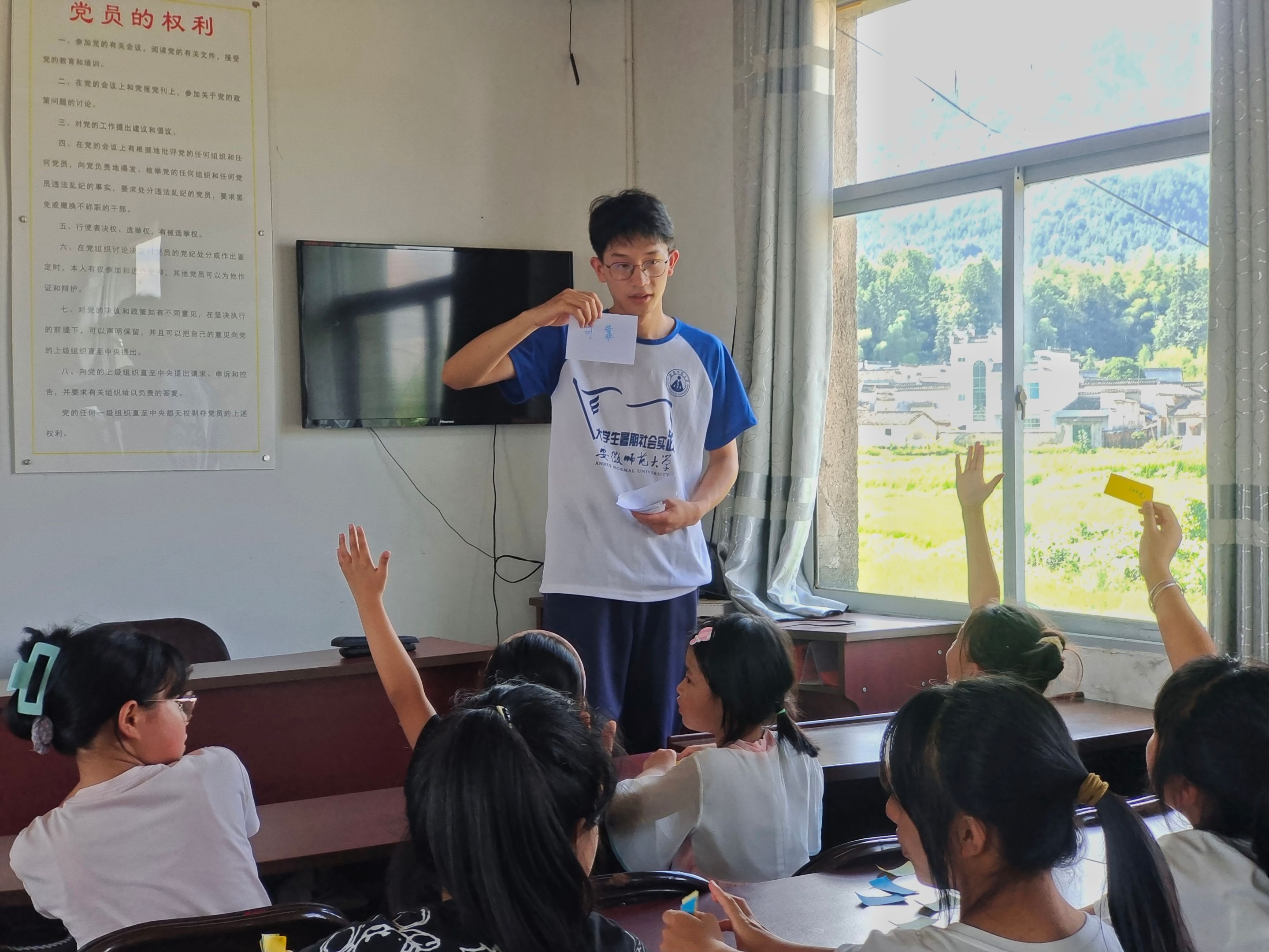 课程开始前,队伍中的心理老师余旭了解到,参加本次暑期课程的学生在此之前还没有上过一次心理课,在老师的提问下也略显腼腆,不敢发言。为了活跃课堂气氛,余旭和徐航两位队员组织了“击鼓传花”的热身游戏,他们以一只粉色千纸鹤为“花”,每次计时结束时,传到“花”的小朋友们都会上台展示自己的才艺。游戏紧张地进行着,期间陈毛文小朋友背诵了一首《泊秦淮》,王姿佳小朋友演唱了歌曲《可能》。渐渐地,学生们拘谨的姿态也逐渐放松下来。