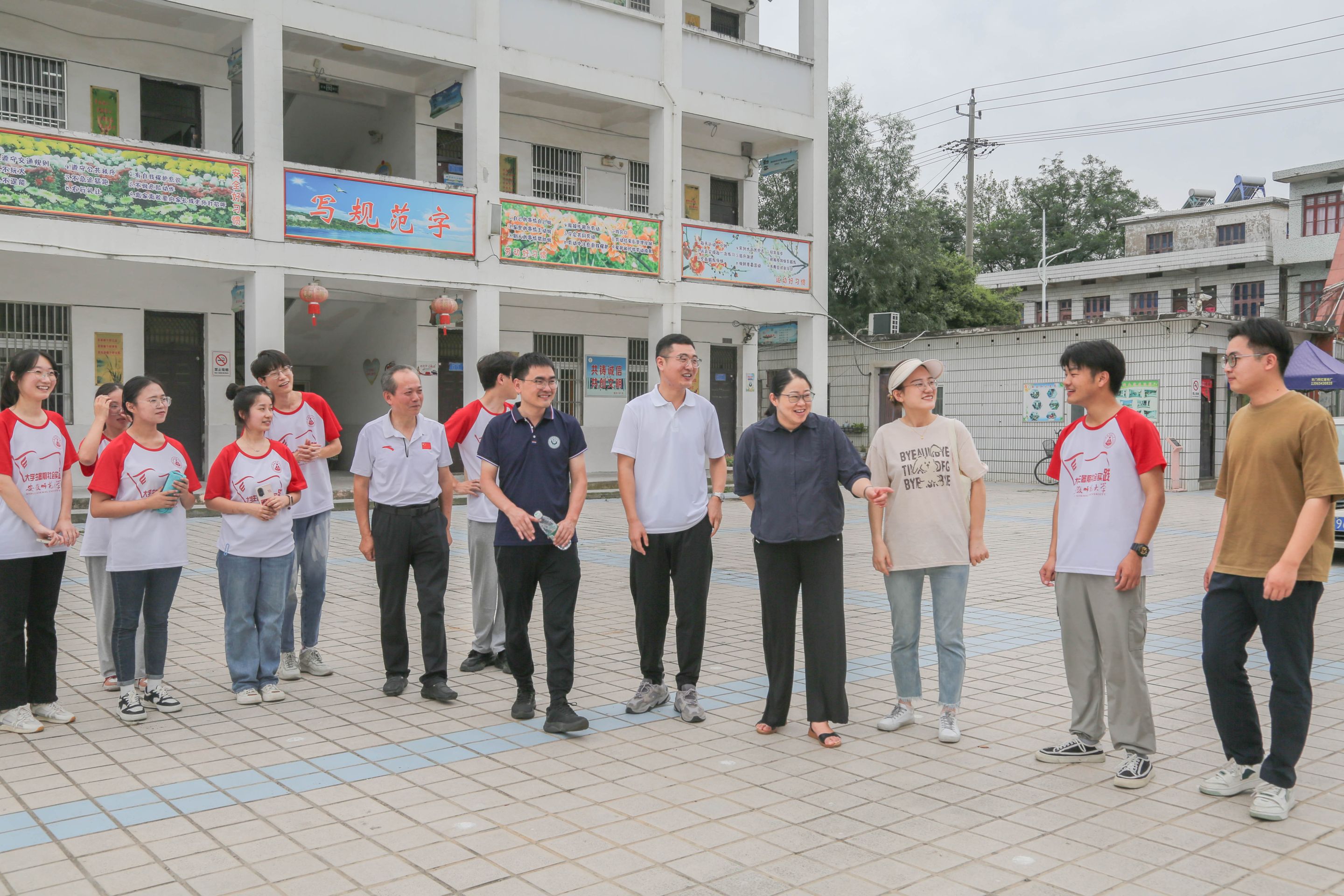 7月13日上午,教育科学学院教授、团队指导教师阮成武,院党委副书记杜凤,副院长韩建涛,学院教师肖龙,院团委书记张理强、辅导员赵茜一行人抵达无为市新河小学,对教科院全心全益赴无为市“皖夏·启梦”本科生实践团队进行走访慰问。福渡中心学校校长许先友,干事许圣军,新河小学校长张弢陪同慰问。