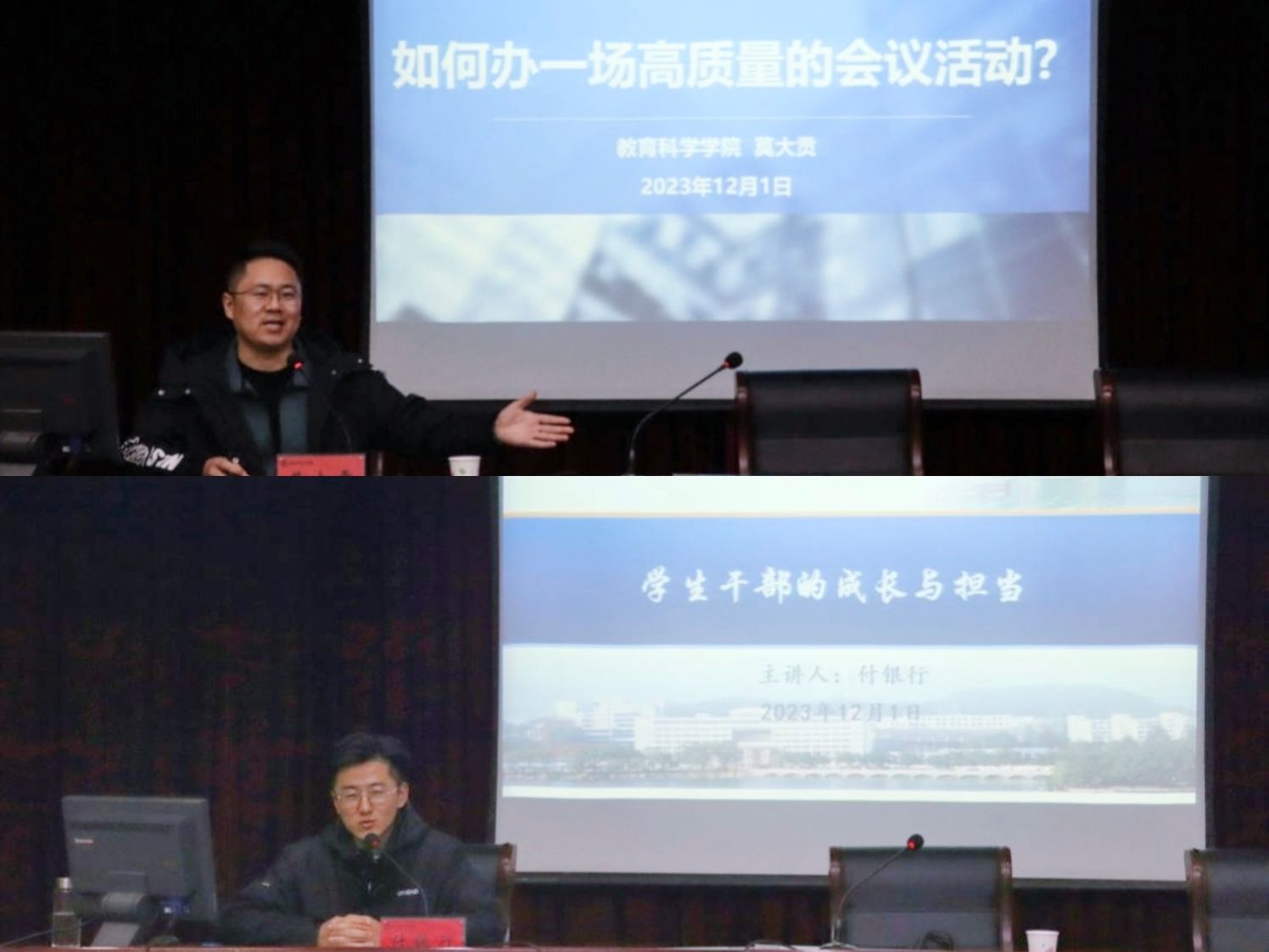 铭担当之涵,骨干勇当先。开班式上,院团委书记付银行为培训班同学讲解如何成为一名好的学生干部,围绕三大能力,六个关键等方面展开交流,期望并鼓励培训班同学成为一名能说、会写、善做的学生干部。学院莫大贡老师做《会务工作的组织与开展》专题报告,他以如何办一场高质量的会议为切入点,就会议的概念,组织及会务工作的实施三方面展开分享,使培训班同学对会议组织有了更深刻的认识,对后续会议工作的安排与开展有很大的指导意义。