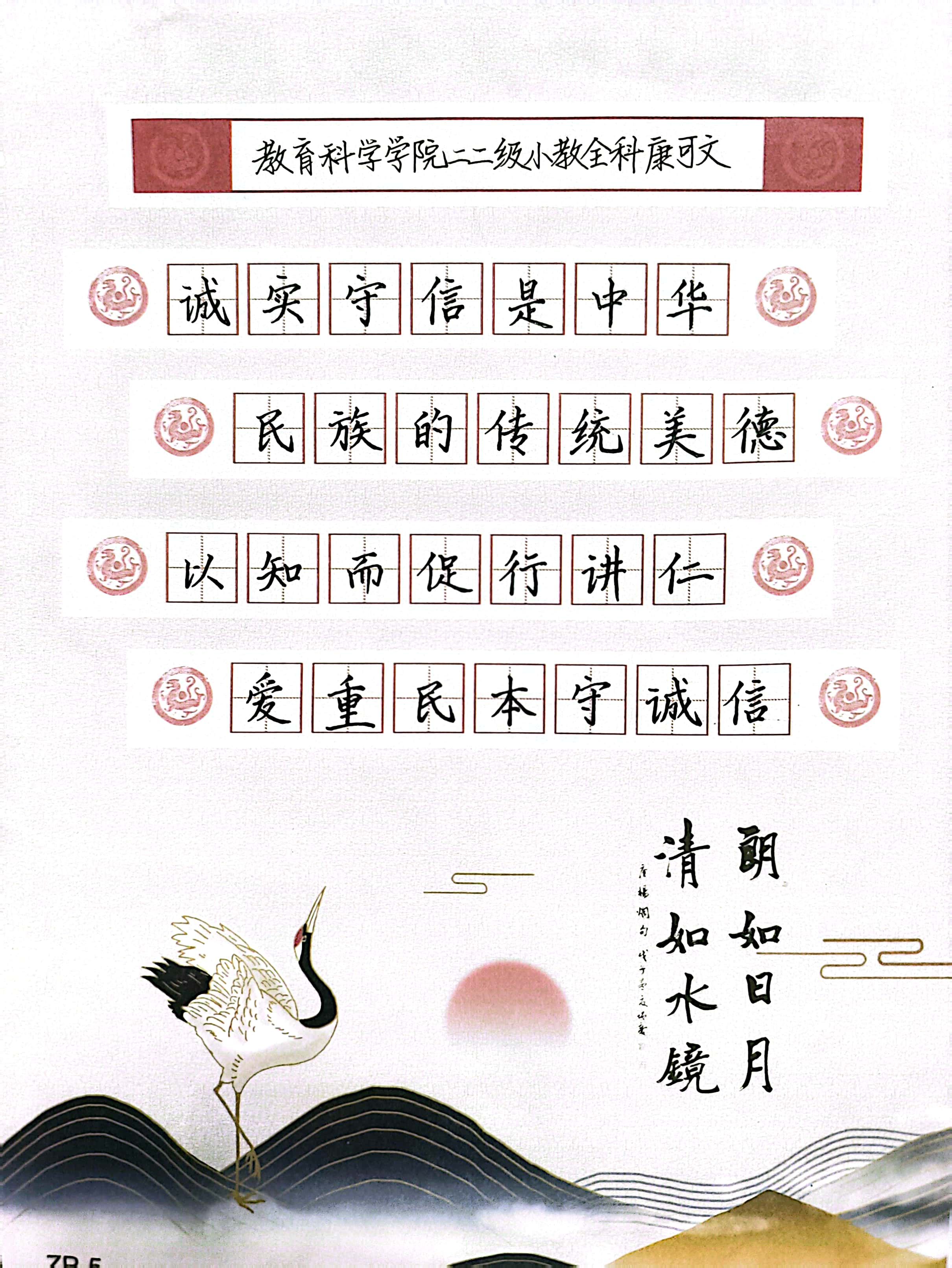 诚信树人,于作品创作下见成长。通过诚信主题作品创作,让学生的诚信理念内化于心、外化于行。学院鼓励各年级学生采用文稿、书法等丰富形式开展诚信主题作品创作,引导学生践行“讲仁爱、重民本、守诚信”的价值理念。面向家庭经济困难学生群体举办“诚信˙成长”主题征文活动,累计收集征文作品276份,进一步推动学院资助工作实现“扶智”与“扶志”的有机结合,助力贫困学子努力奋进、恪守诚信、心怀感恩。