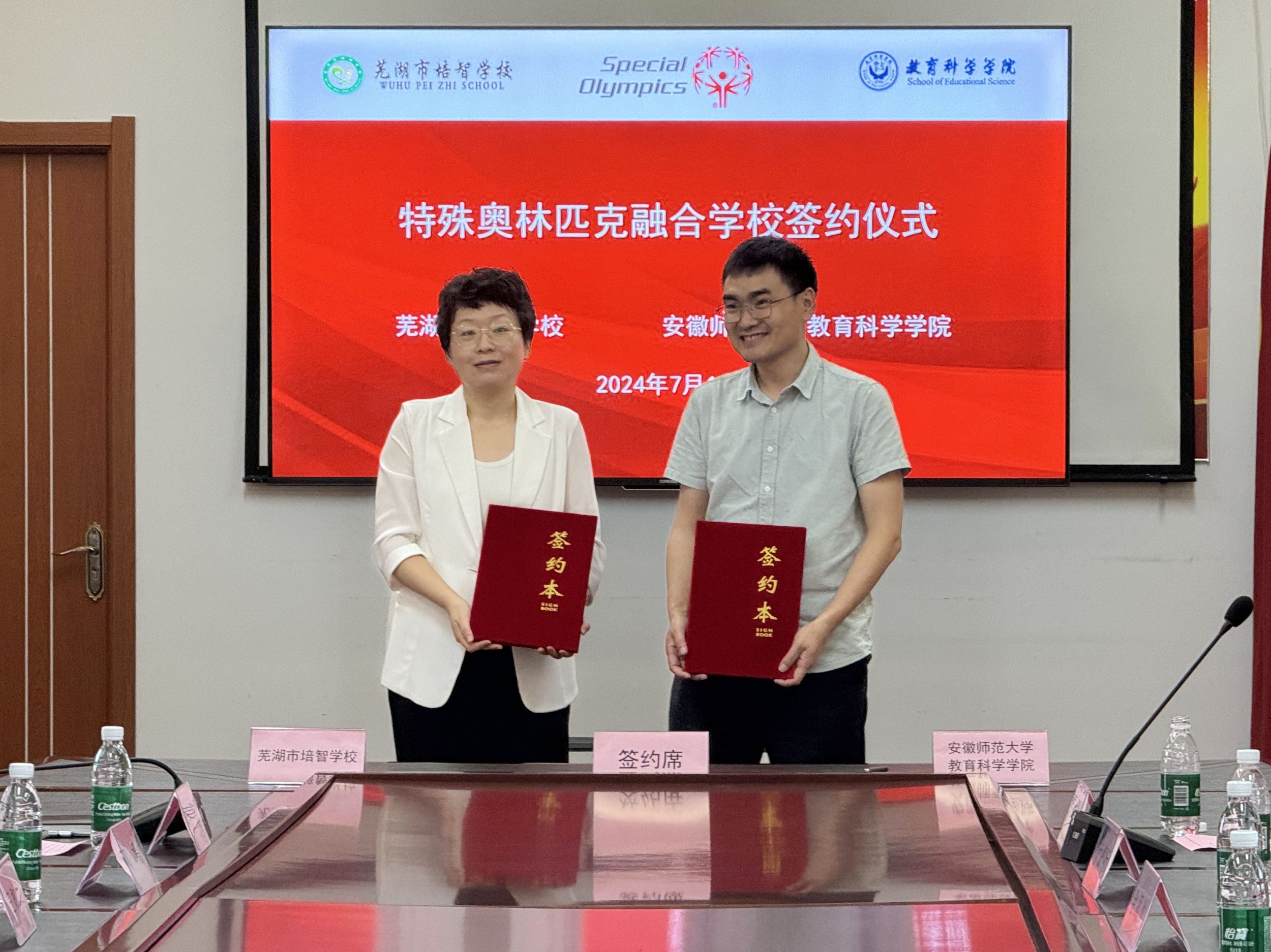 为了全面落实立德树人的根本任务,遵循特殊教育规律和特殊学生的身心发展规律,2024年7月12日,“特殊奥林匹克东亚区融合学校”签约仪式在芜湖市培智学校大会议室举行,仪式分为线上和线下两个部分。国际特殊奥林匹克东亚区组织发展部专员常芙蓉通过线上参与仪式,教育科学学院副院长韩建涛、团委书记付银行、2023级本科生辅导员兼团队指导老师金凤仙,芜湖市培智学校教务处主任茆婕、总务处副主任邓媛、体卫艺与德育处副主任兼团支部书记张康、教育科学学院“全心全益”赴芜湖市培智学校智力障碍青少年特殊教育服务本科生社会实践团队、芜湖市培智学校特奥运动员代表出席签约仪式。仪式强调安徽金年会与芜湖市培智学校将共同建立融合教育支持体系,构建尊重、接纳、共享的教育人文环境,为特殊儿童提供彰显自我的平台,助力智力障碍青少年和非智力障碍青少年和谐相处、携手共进、共同成长。