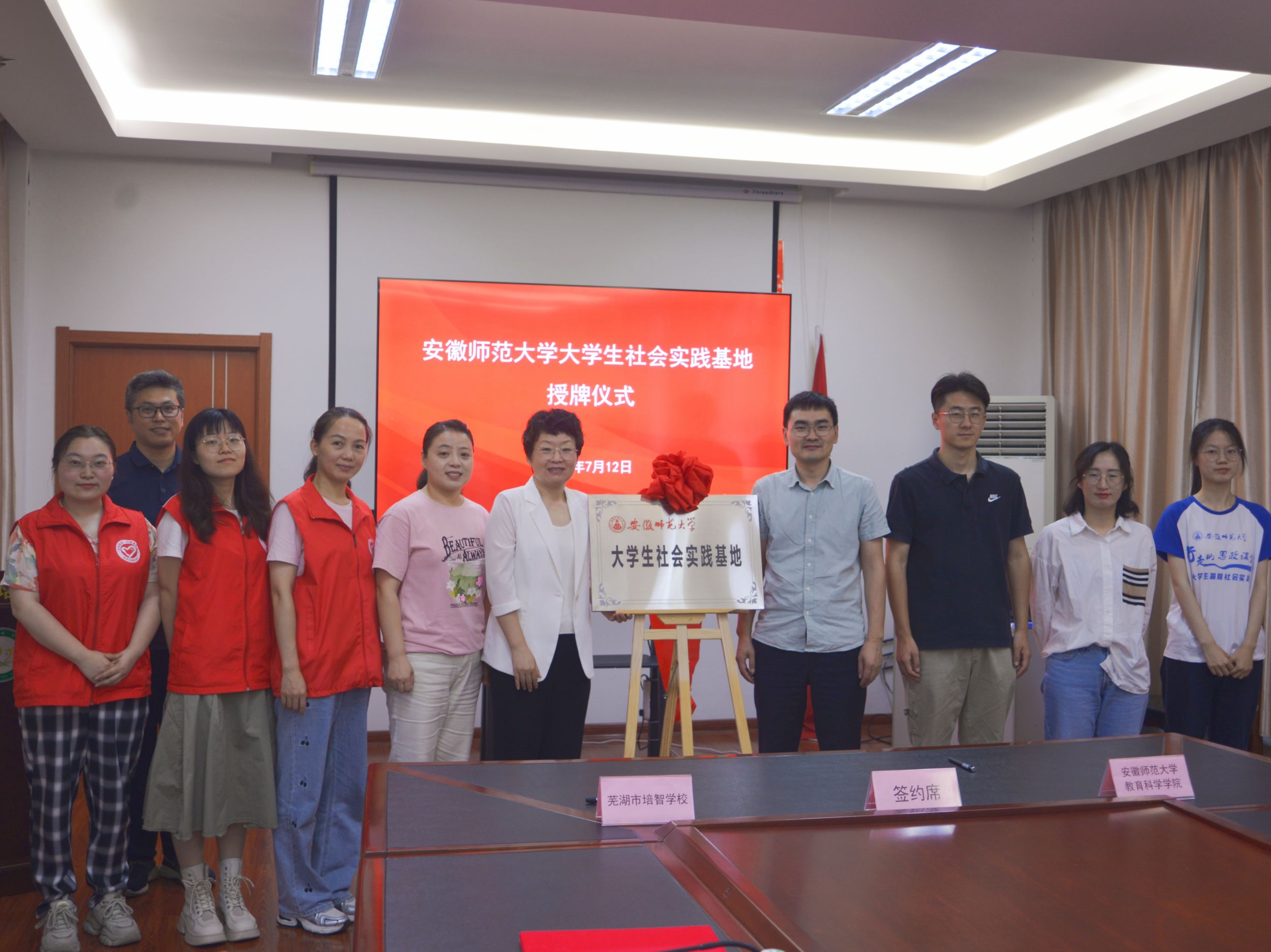 教育科学学院“全心全益”赴芜湖市培智学校智力障碍青少年特殊教育服务本科生社会实践团队以本次暑期社会实践为契机,与芜湖市培智学校共建大学生暑期社会实践基地,授牌仪式于2024年7月12日在芜湖市培智学校大会议室举行。芜湖市培智学校代表茆婕就目前取得成果进行汇报。茆婕指出,作为特奥羽毛球训练基地,芜湖市培智学校为全国培养了多名特奥优秀运动员,他们在省市级等各类特殊奥林匹克运动会上获得奖牌累计近百余枚。茆婕希望就本次授牌仪式,能够与安徽金年会建立紧密的联系,为学生提供更多展现自我的平台,为社会输送更多特殊奥林匹克运动人才。