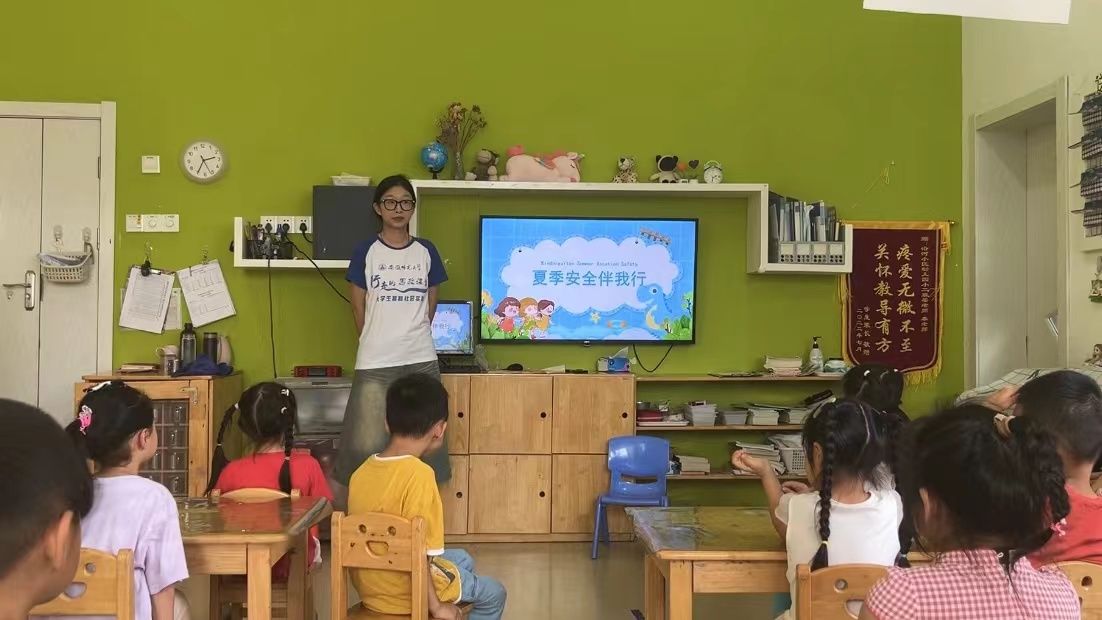 7月10日下午,教育科学学院全心全益赴芜湖市沿河小区幼儿园“五彩乐迪”本科生社会实践团队队员郭雯荻及范刘云在芜湖市沿河小区幼儿园大二班进行了《夏季安全伴我行》幼儿安全教育主题课程。