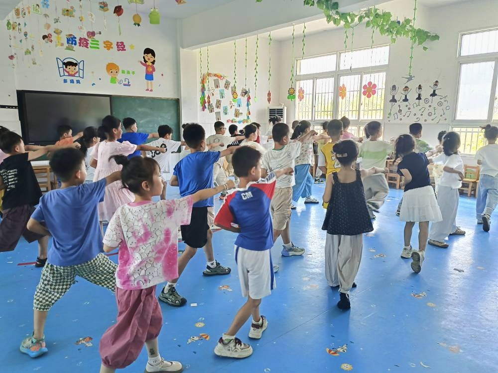 “抱拳当胸,马步如桩”志愿者宋佳佳以武术礼仪开篇,系统教授五步拳“弓步冲拳、弹腿冲拳”等经典动作。为适配不同年龄段学生,她将动作要领编成口诀“左弓步像射箭,右冲拳如打虎”,并组织小组对抗展示。