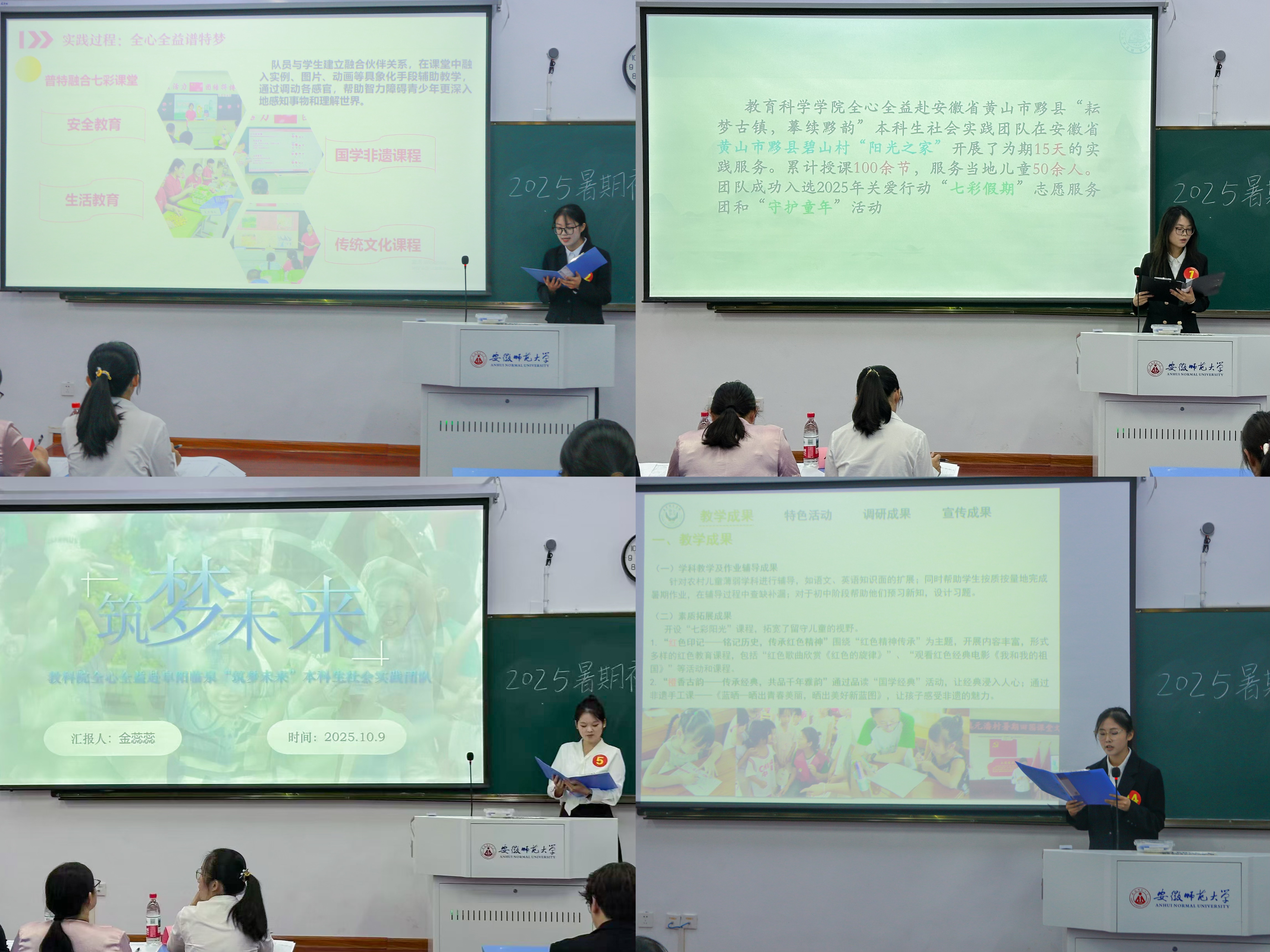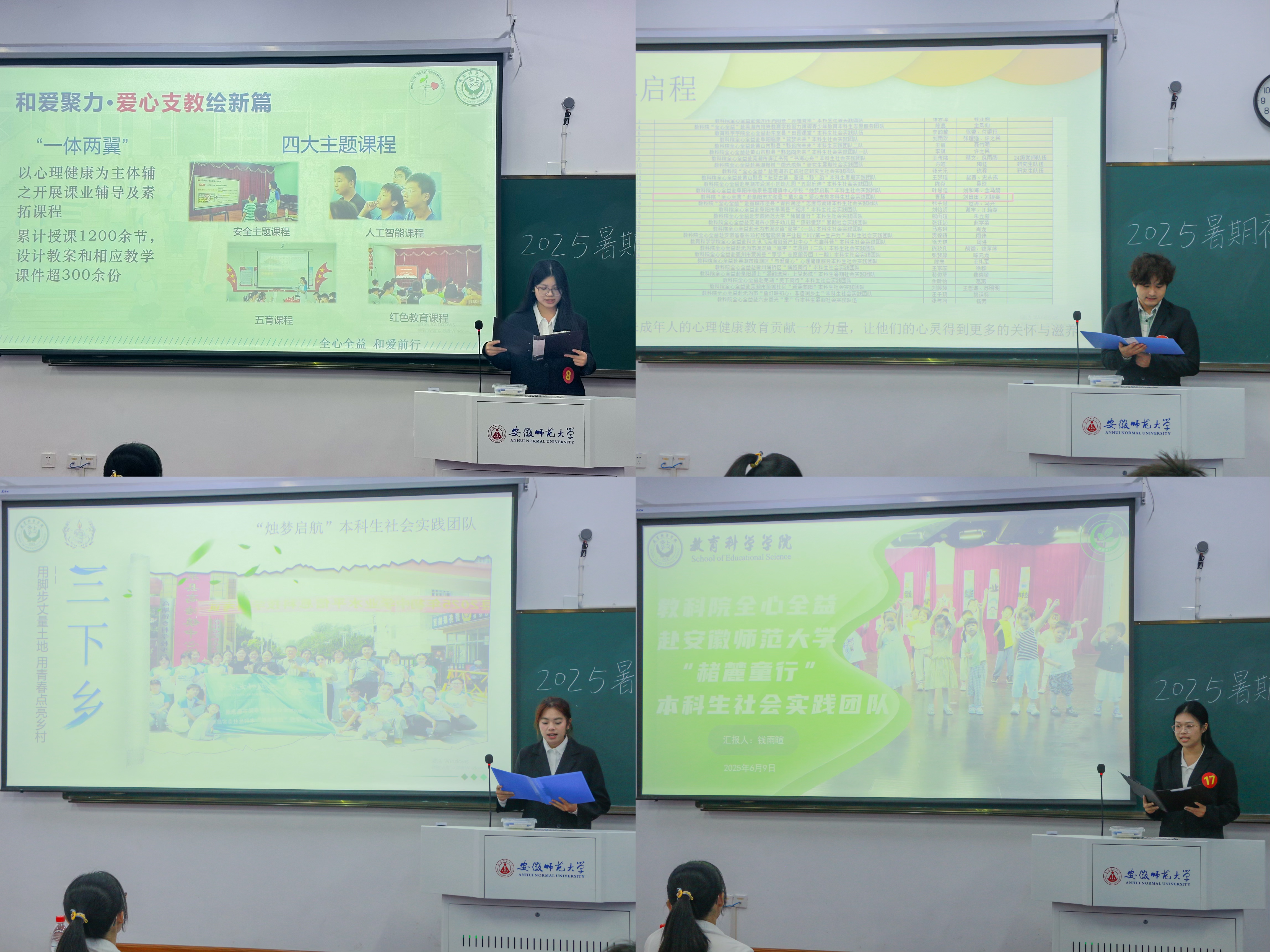 今年,学院共组建38支实践队,围绕乡村振兴、爱心支教、文化传承、基层治理调研等主题开展暑期社会实践。经前期遴选,学院20支重点团队参加本次答辩,答辩现场,各团队围绕实践主题娓娓道来:或讲述扎根山村支教的晨曦与星光,或呈现调研乡土中国的数据与温度,或重现非遗课堂里的童声与古韵。多元视角交织成一幅立体画卷,生动诠释了教科学子在乡村振兴一线、传统文化深处、农村未成年人身边播撒知识火种、贡献青春智慧的扎实足迹与广泛回响,集中呈现了教科学子把课堂搬到田野、把行动写在大地的青春答卷。暑期,665名教科学子奔赴一线,项目质量攀升、成果亮点纷呈,省市级媒体连续聚焦,实践育人实效在广度与深度上实现双跃升。