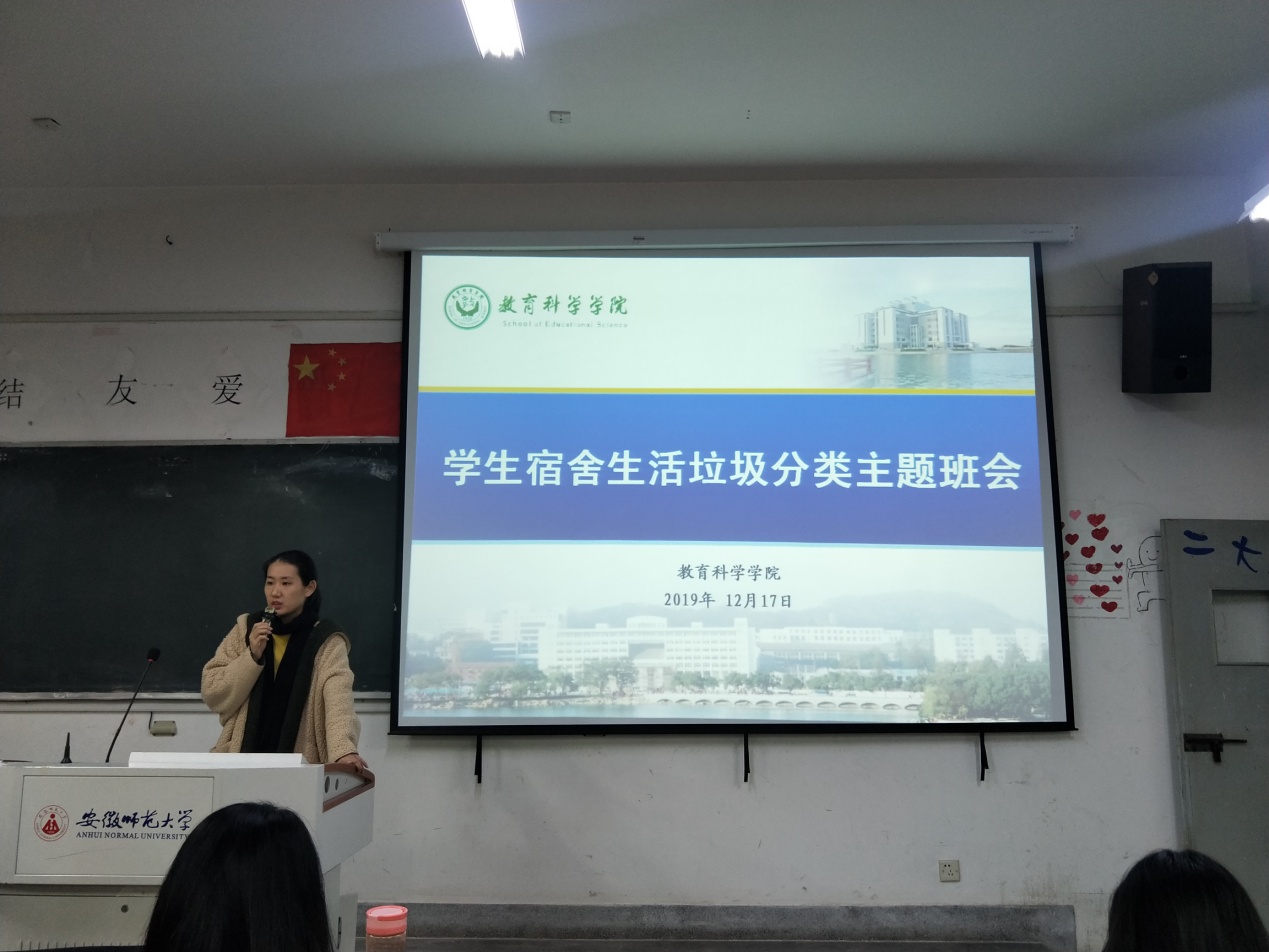 按照学校统一部署,为营造良好的校园环境,加强同学们垃圾分类回收意识,引导同学们正确投放垃圾,促进我院切实有效做好垃圾分类工作,确保垃圾分类认识到位、执行到人、全员参加,我院2017级全体同学召开“学生宿舍生活垃圾分类”的主题班会。会上2017级辅导员谭茹轩老师强调了实行垃圾分类的重要性和必要性,围绕什么是生活垃圾分类、具体分类类别、如何分类、分类过程中需要注意的事项等问题做了详细介绍,并以提问的方式,详细介绍了“垃圾四分法”,在互动间帮助同学们深入了解四类垃圾的特性,为同学们正确精准实行垃圾分类奠定基础。同时呼吁广大同学培养垃圾分类的好习惯,一起为改善生活环境努力,为绿色发展、可持续发展做贡献。