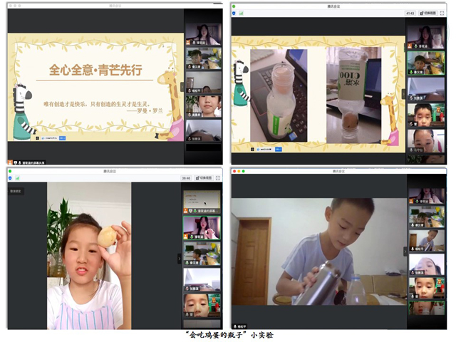 8月8日上午,1-4年级的小学生们在志愿者和家长的协助下进入网络课堂,志愿者准备的“会吃鸡蛋的瓶子”、“大力士—纸”和“水制放大镜”等等课堂小实验引起了小朋友们的兴趣。活动过程中,小朋友们积极踊跃地回答问题。在“会吃鸡蛋的瓶子”实验中,志愿者首先利用已准备好的材料亲自演示了一遍实验,接着在家长协助下,小朋友们拿出准备好的塑料瓶、热水、鸡蛋动手实验,志愿者和助教分工协调关注小朋友们的实验情况,确保每位小朋友们都能参与进来。