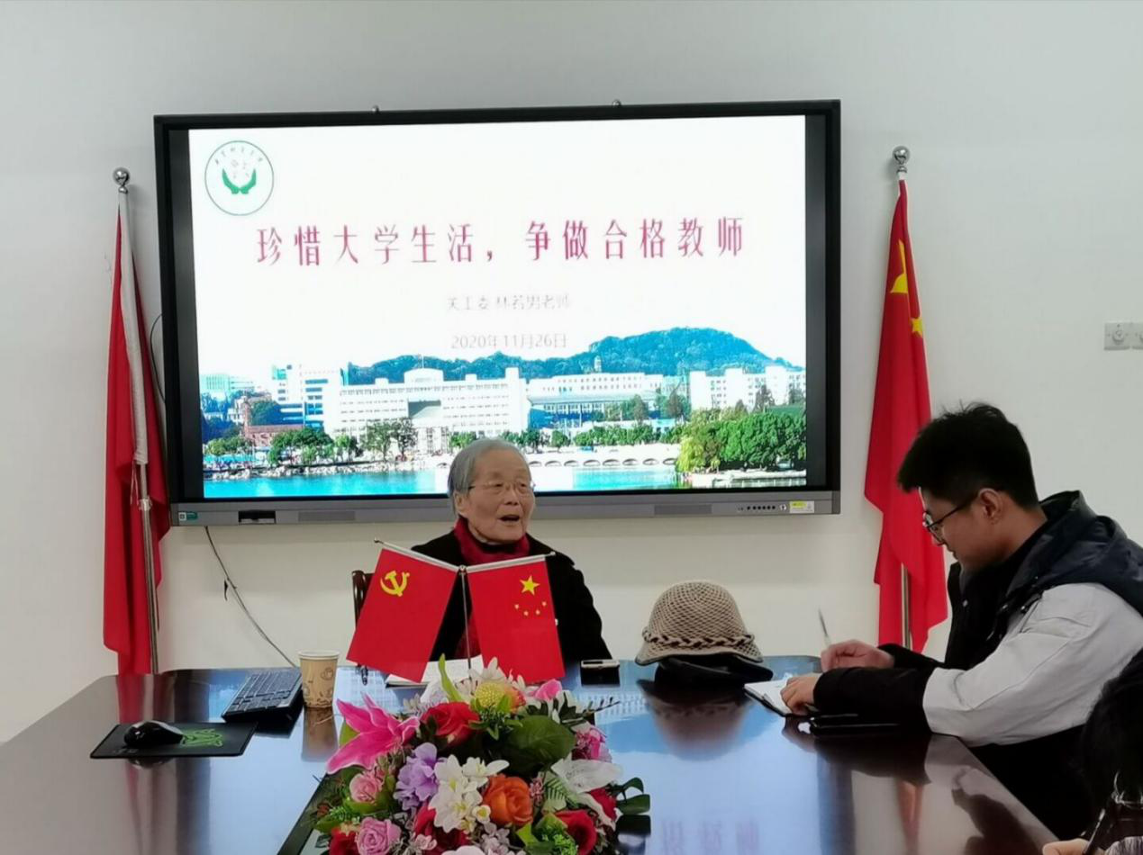 和蔼可亲、朱颜鹤发的林老师首先向同学们分享了自己的求学经历,言语中透露着的坚韧不羁,赢得了同学们热烈的掌声。89高龄的林老师出生于北京,经历过抗日战争、解放战争,见证国大典徐徐升起的新中国第一面五星红旗。在求学期间,因家庭贫困几经辍学,后凭借自身努力考入华东师范大学,毕业后服从国家分配到安徽师范大学任教。