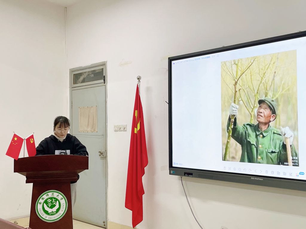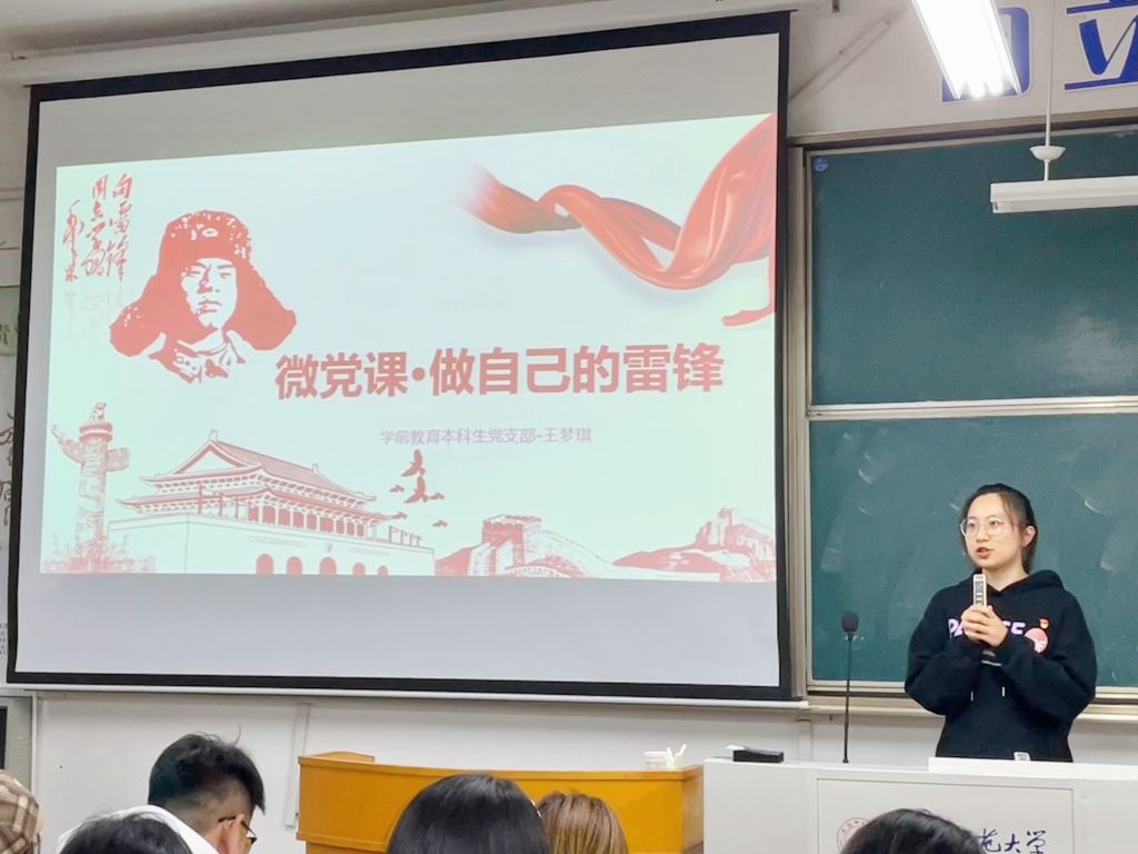 入党启蒙教育培训班于3月11日开展系列微党课宣讲活动,弘扬雷锋精神。王梦琪以“做自己的雷锋”为主题进行理论宣讲,支部全体成员参与并认真学习。她通过“昨天,何为雷锋精神之内涵”、“今天,谁是雷锋”以及“明天,能否自己的雷锋”三问引起启蒙班同学以及支部同学的思考。她指出了雷锋精神的四点内涵:奉献、钉子精神、螺丝钉精神以及艰苦奋斗精神,分享小学教育党支部的优秀党员代表吴烈龙的志愿服务事件,让我们发现身边的时代雷锋,鼓励我们向榜样学习,以“雷锋七问”引导在座的同学积极思考,鼓励每位同学做自己的雷锋。