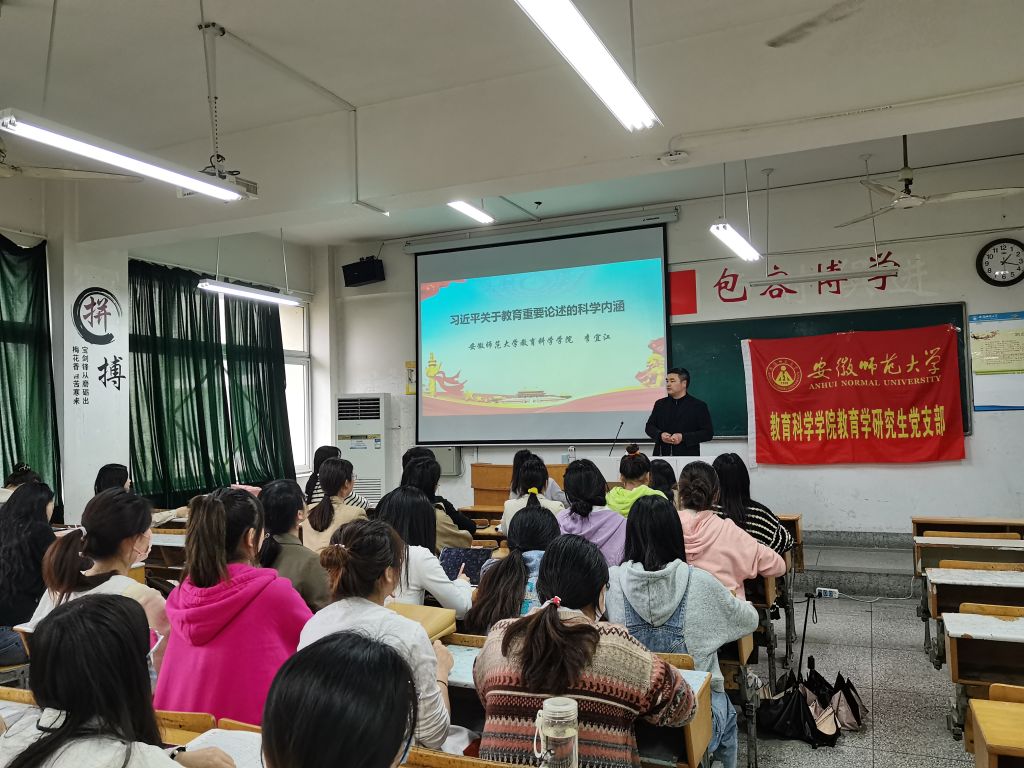 4月13日下午,教育科学学院院长李宜江在田楼8204教室为教育学研究生党支部上“习近平关于教育重要论述的科学内涵”主题党课。党课采用线上线下相结合的方式,因实习或疫情等原因暂未返校的党员通过腾讯会议参加线上学习,支部在校党员参加线下集中学习。
