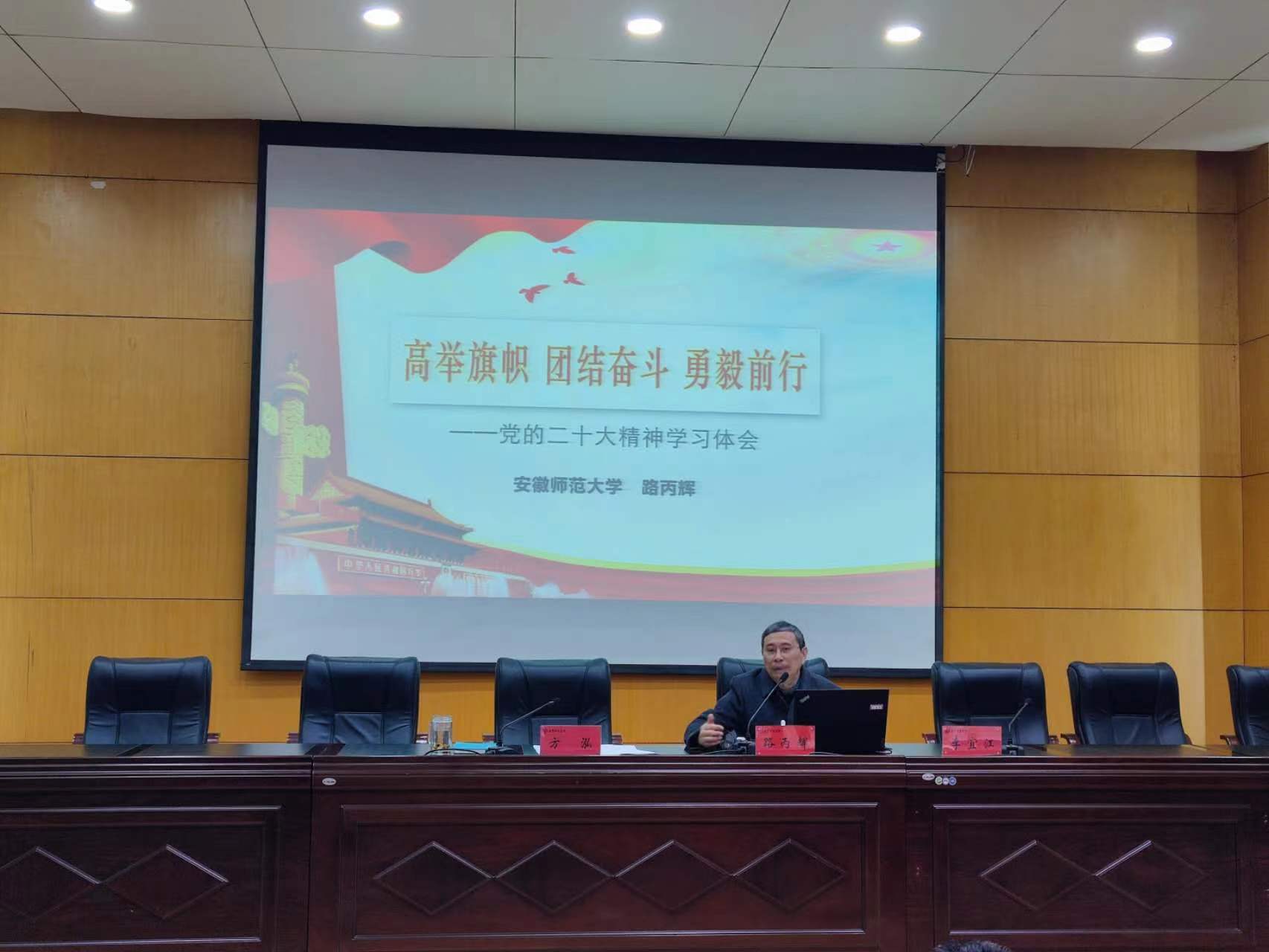 会上,全国优秀共产党员、全国先进工作者、全国“最美思政课教师”、全国模范教师、全国师德标兵、党的二十大代表、安徽师范大学校党委委员、马克思主义学院路丙辉教授作《高举旗帜 团结奋斗 勇毅前行——党的二十大精神学习体会》专题辅导报告,从好听、好看、好学三个方面对党的二十大报告的结构和内容作出深度解读。路丙辉指出党的二十大报告结构紧密、逻辑严密、文字缜密,内容总结实、理论新、擘画全,要从整体把握、重点突出和联系实际这三个维度,全面系统学习、深刻领会把握、深入贯彻落实党的二十大精神。方泓要求全体教职工要提高政治站位,增强政治自觉,把学习宣传贯彻党的二十大精神作为当前首要政治任务抓紧抓好,努力用习近平新时代中国特色社会主义思想武装头脑,指导实践,推动工作,认真落实立德树人根本任务,立足岗位履职尽责,不负为党育人、为国育才光荣使命。各位分管副院长通报了假期工作,并就新学期教学、科研等工作做出布置,院长李宜江会上从人才培养、师资队伍建设、学科建设、学位点建设、专业建设,内部治理等方面全面总结2022年学院工作并展望2023年工作。