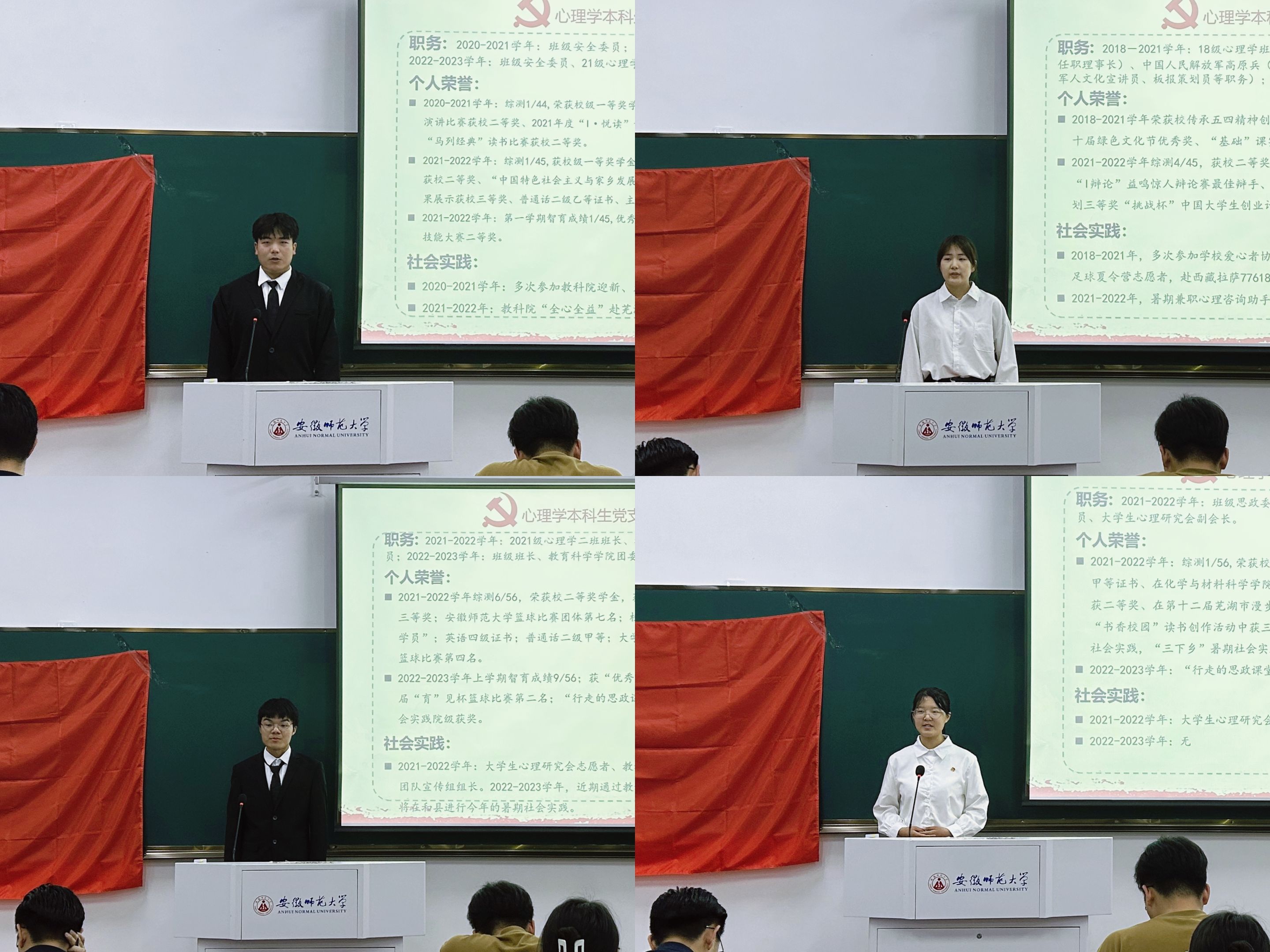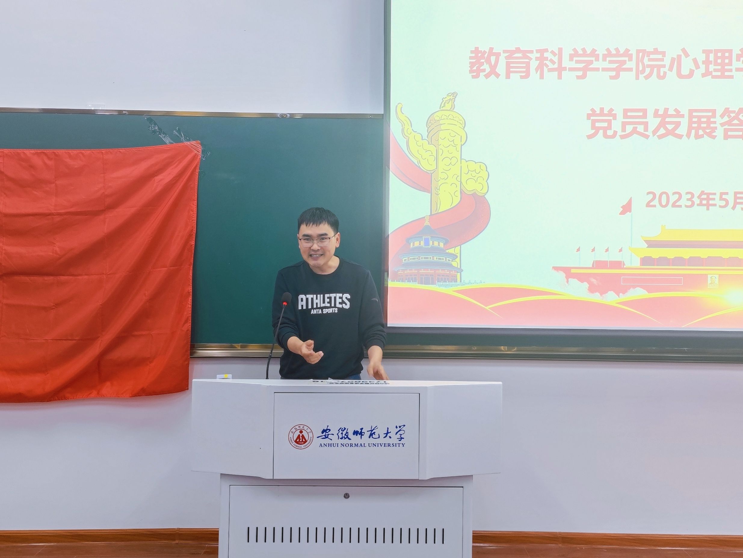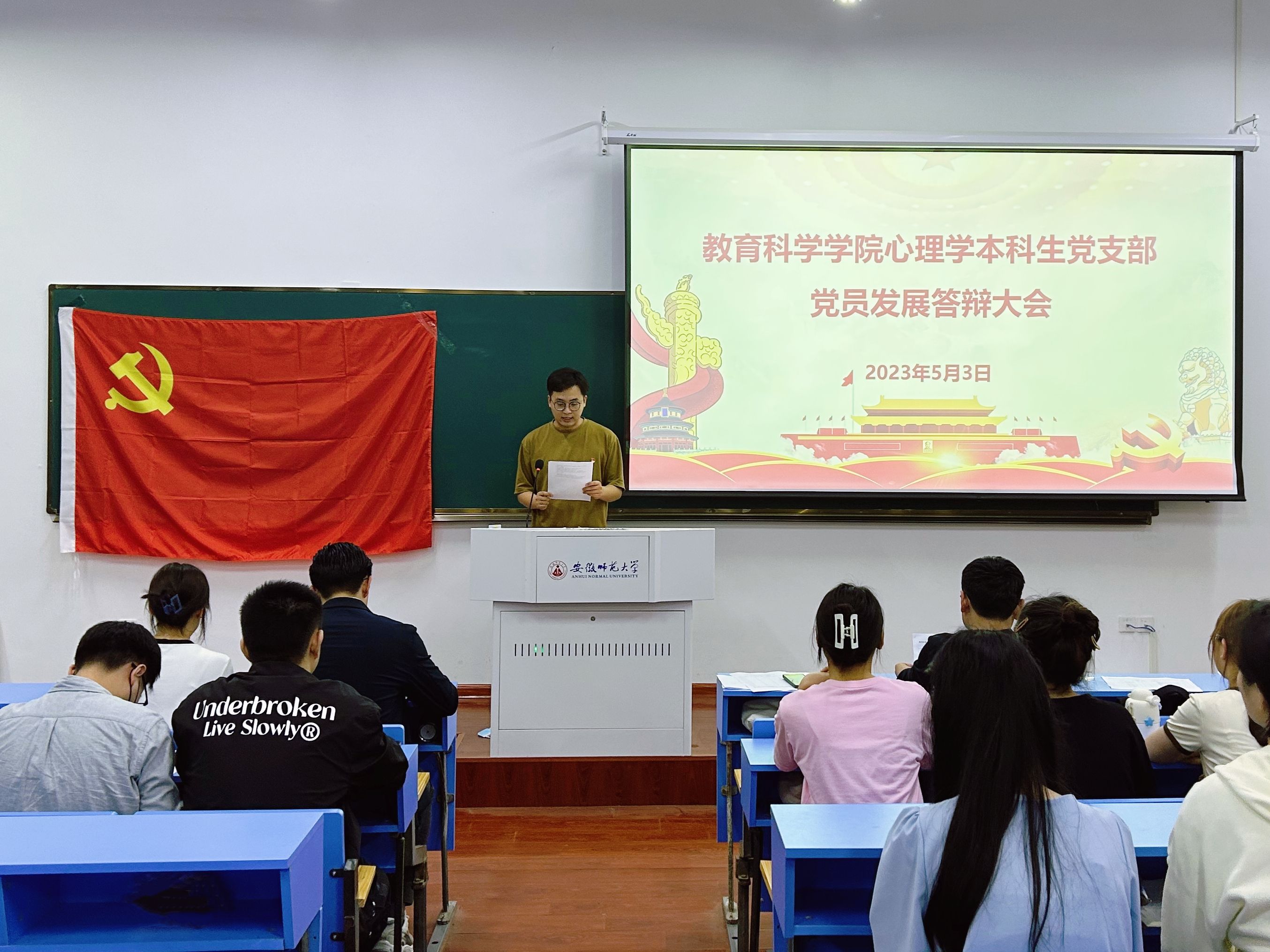 为确保党员发展质量,考察拟发展对象的理论素养和综合素质,2023年5月3日晚,教育科学学院心理学本科生党支部于教学楼1108教室召开了2023年上半年党员发展答辩大会。教育科学学院副院长韩建涛、心理学本科生党支部书记张理强、支部组织委员程啸,以及2019级辅导员濮楠楠组成答辩委员会,支部全体学生党员、入党积极分子参与了现场评议工作。