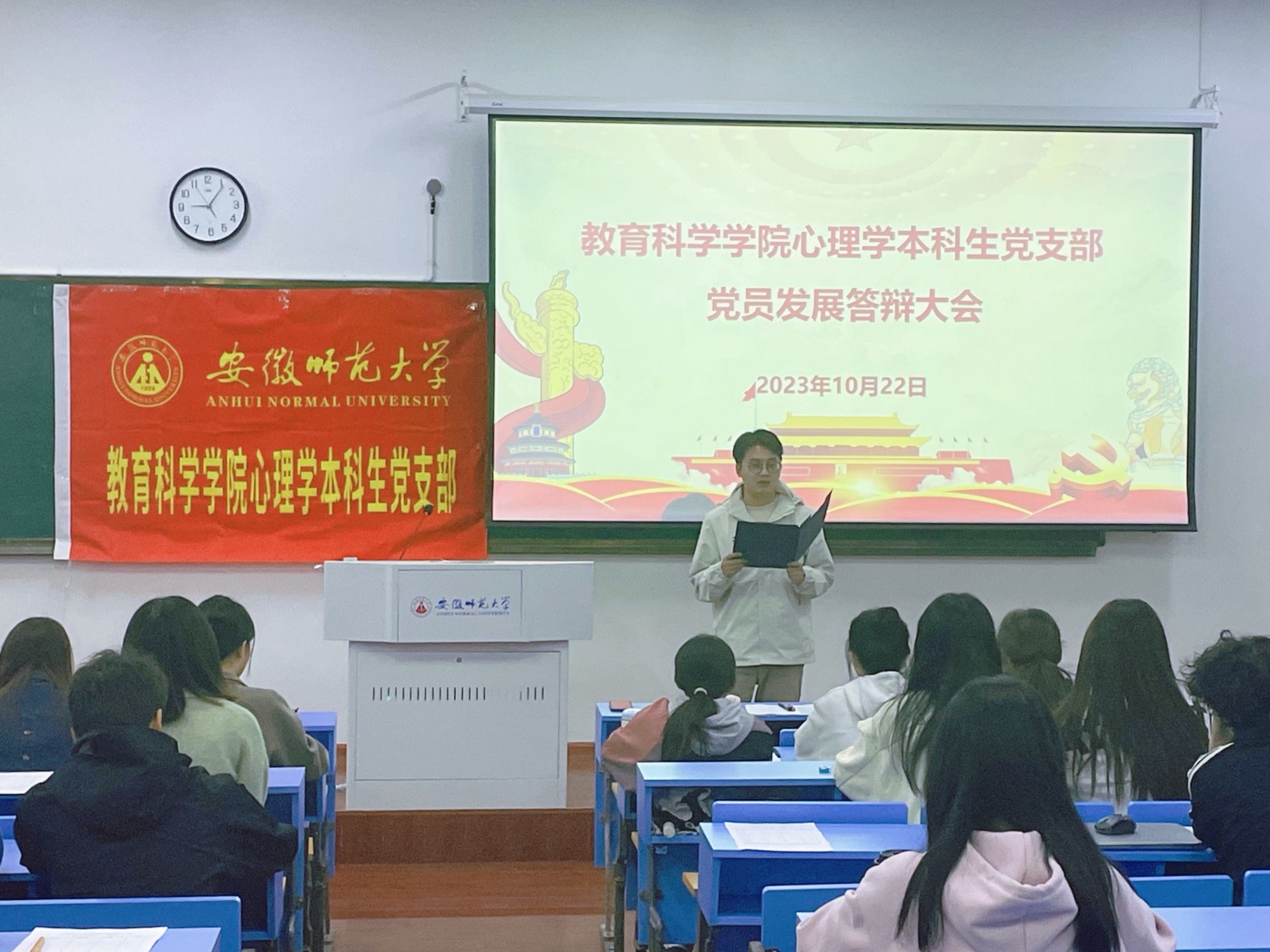 为确保党员发展质量,考察拟发展对象的理论素养和综合素质,2023年10月22日上午,教育科学学院心理学本科生党支部于教学楼1108教室召开了2023年下半年党员发展答辩大会。心理学本科生党支部全体学生党员、入党积极分子参与了现场评议工作,会议由支部书记张理强主持。