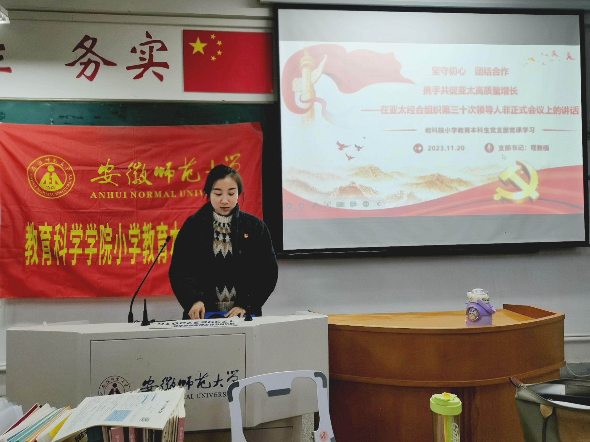 为深入学习贯彻习近平新时代中国特色社会主义思想,打牢思想理论基础,加强党员队伍建设,2023年11月20日下午,教育科学学院小学教育本科生党支部于田楼8205教室开展学习习近平在亚太经合组织第三十次领导人非正式会议上的讲话党课学习活动。