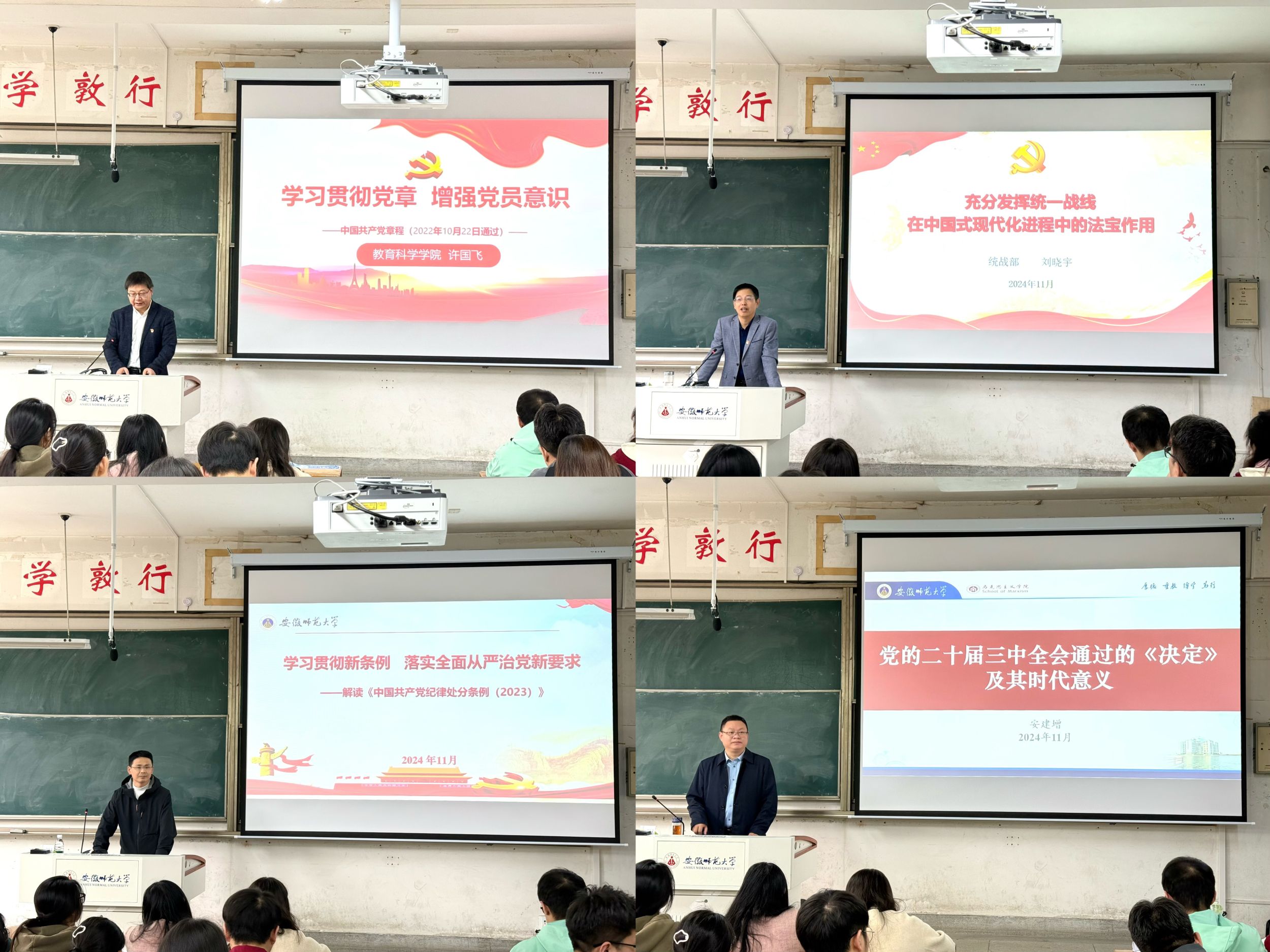 11月9日上午,院党委书记许国飞、21级辅导员赵茜以及全体培训班同学参与开班典礼。随后,多位专家老师结合主题为学员们带来精彩丰富的课程。院党委书记许国飞以“学习贯彻新党章,增强党员意识为题”带领大家深入研读了《中国共产党章程》;校统战部常务副部长刘晓宇给大家解读了统一战线在中国式现代化进程中的法宝作用;校纪委办公室案管审理室主任刘长生带领大家深入学习领会《中国共产党纪律处分条例(2023)》,告诫学员们要绷紧纪律之弦,做合格共产党员;马克思主义学院副教授安建增带领大家学习探讨了党的二十届三中全会通过的《决定》及其时代意义。这些理论课程不仅帮助学员们增强对党的理论知识的学习和理解,同时也提高了同学们的党员意识、进一步锤炼党性修养。