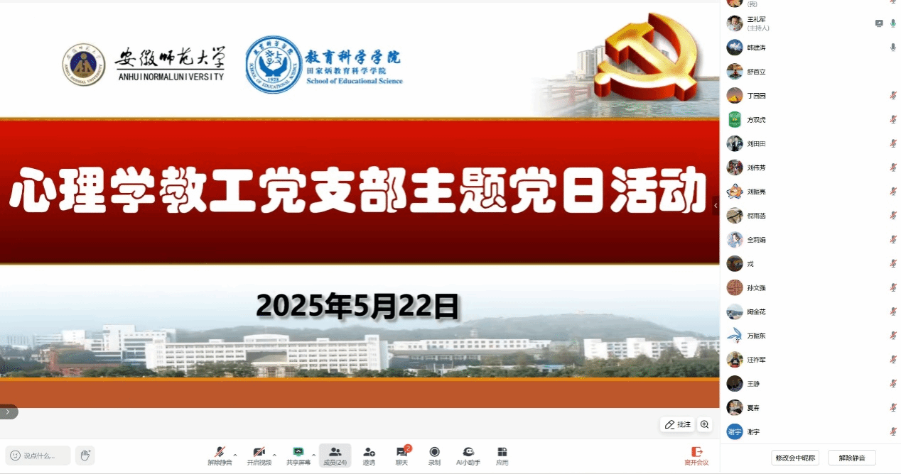 2025年5月22日晚,心理学教工党支部在线上开展主题党日活动。党支部书记王礼军主持,支部党员教师及全体专业教师参与会议。