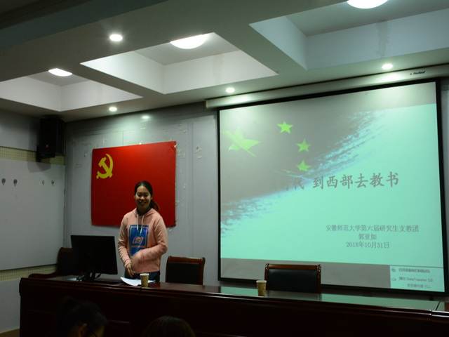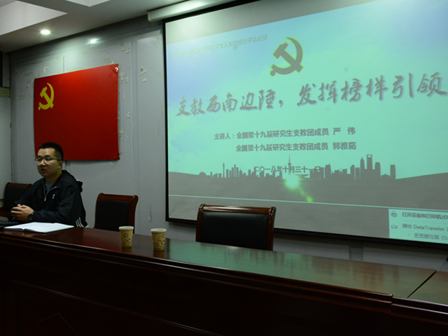 本网讯(教科院 施羽晗 艾瑞雪)为进一步加深培训班学员对“全心全意为人民服务”这一宗旨的理解,提高培训班学员们的党性修养。10月31日晚7点,全国第十九届研究生支教团队成员严伟、郭亚如同学应邀来我院分享他们的西部支教故事。培训班全体学员参与这次讲座,讲座由培训班班主任龚伟主持。