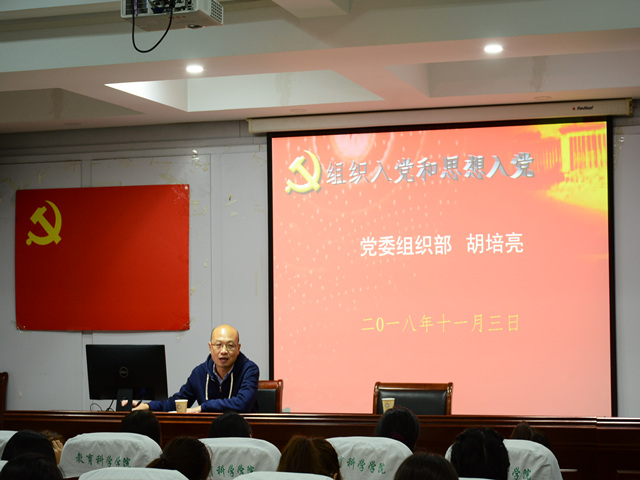 本网讯(教科院 施羽晗 艾瑞雪)为了端正入党积极分子的入党动机,使培训班学员们明确入党程序。11月3日晚七点,我院特邀校党委组织部正处级组织员胡培亮在院学术交流中心为培训班学员们开展以“ 组织入党和思想入党”为主题的党课。培训班全体学员参与本次党课学习活动,活动由培训班班主任龚伟主持。