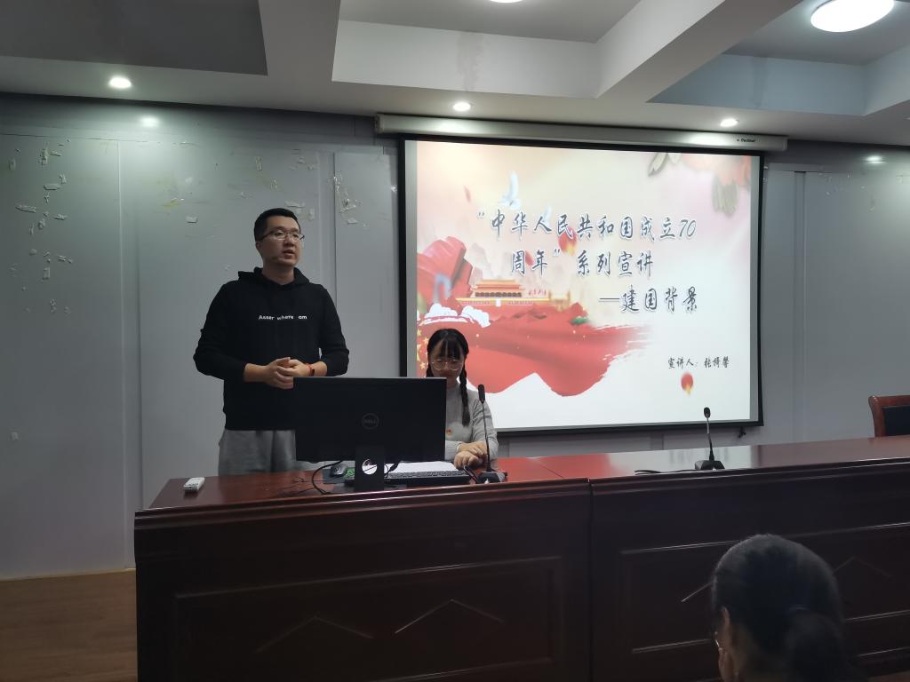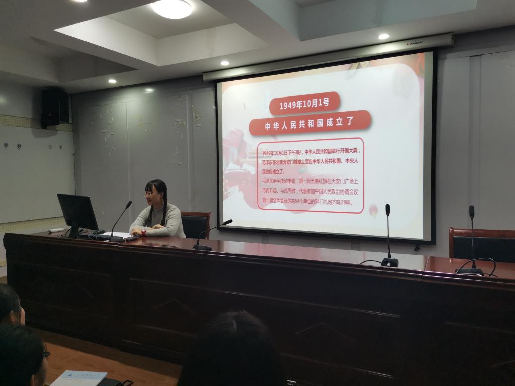 张旖馨同学以近期热播的电影《我和我的祖国》中“前夜”片段为引,从政治、经济、文化和国际局势四个方面简要介绍了中华人民共和国成立背景,并结合当前中美贸易摩擦等热点话题,帮助同学们从纷繁复杂的舆论宣传中把握时政脉络,厘清思想认识。紧接着,张旖馨学姐还结合亲身经历,提醒大家在大学中要肯吃苦,勇挑战,敢担当。