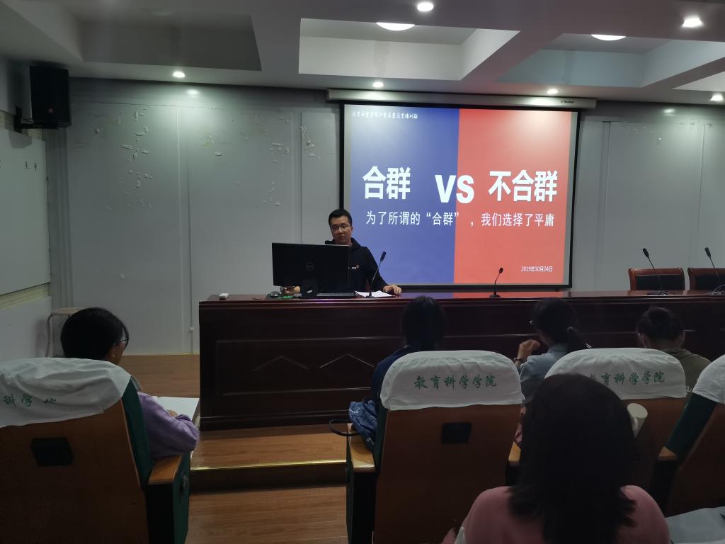 随后,龚伟老师以大学生群体中的“合群”为主题深刻剖析了三类所谓“合群”,即课堂上的“沉默式合群”、团体中的“机械式合群”和生活中的“迎合式合群”存在的问题,并告诫同学们在大学中要学会做一个“孤独”的人,客观、独立、理智地思考;做一个有计划的人,具体、清晰、明确地学习;做一个自信的人,勇敢、大气、优秀地生活。