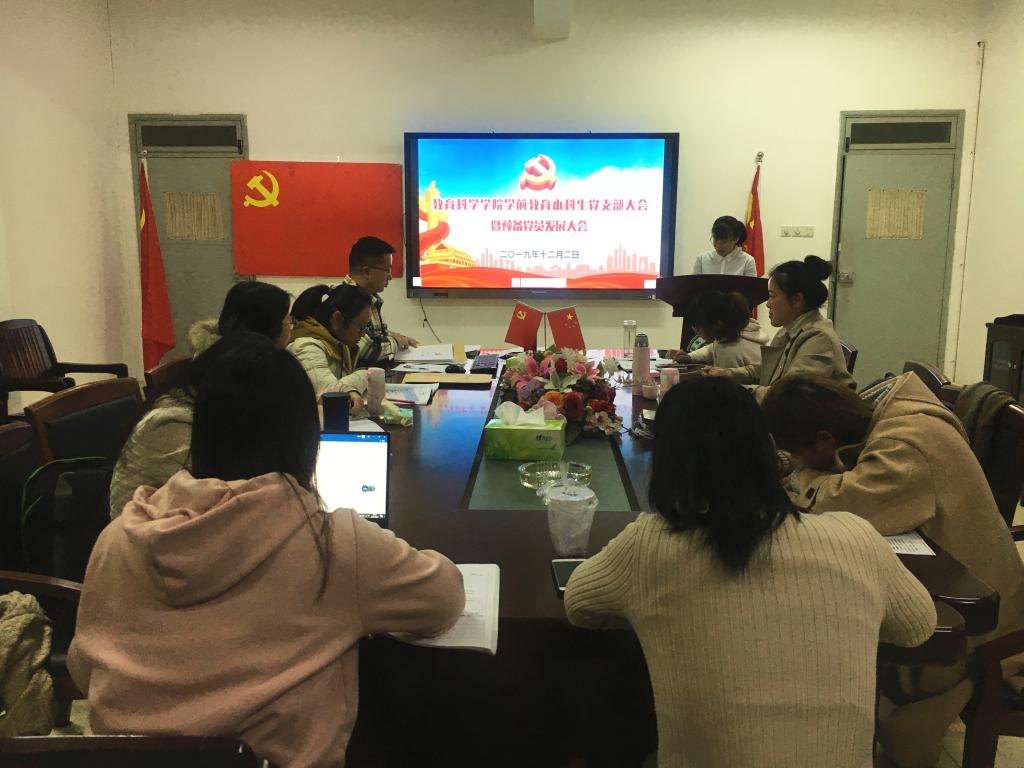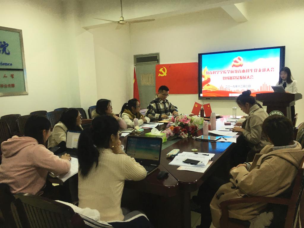 本网讯(教科院 黄文静)为进一步提升党员发展质量,规范党员发展流程,为党组织输送新鲜血液,12月2日晚19:00,学前教育本科生党支部大会暨预备党员发展大会在学院308会议室举行,支部全体成员以及五名发展对象参加了会议,此次会议由支部书记龚伟主持。