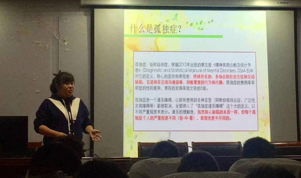 10月24日下午14:00,“启蒙班”邀请芜湖市暖星小镇特殊儿童学校相关负责人来到学院就孤独症儿童帮扶工作进行了宣讲会。与指导。陈雄老师结合自己的亲身经历为同学们介绍了孤独症的常见症状和孤独症儿童的典型特点,即持续存在的、多场合的社会交往和互动缺陷、语言和非语言的沟通困难、刻板重复的行为和狭隘的兴趣,并提醒同学们在实践中作为“影子老师”应注意的一些辅课技巧。“来自星星的孩子”虽然很难用言语表达他们的真实想法和内心世界,但是他们在努力地向外面的世界靠近。因此,陈老师呼吁我们青年大学生,用真心去关注和爱护特需儿童,用行动去接纳和改善特殊儿童及其家庭的生活。龚伟老师则希望同学们结合自己的专业特长以及特殊教育的具体要求,有针对性地参与志愿帮扶,在不触及孩子隐私的前提下关心他们,悦纳他们,在力所能及的范围内提供必要的辅助。