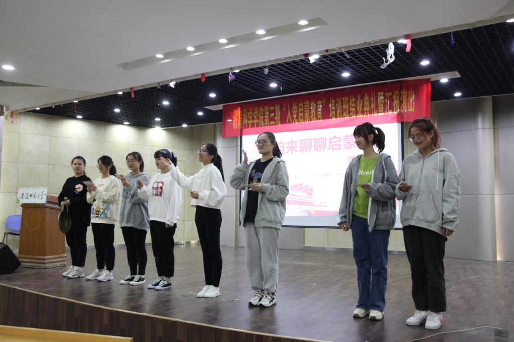 首先,在场所有人跟随视频一起回顾了第三期学员的启蒙班生活,视频里不断出现理论课学习、考察会志愿服务等令人难忘的属于启蒙班的回忆。随后,五个大组依次进行汇报演出,第一组的节目是《三句半——咱来聊聊启蒙班》,每个人用简短的话语以及诙谐的语气与大家分享了她们多姿多彩的启蒙班生活;第二组《我和启蒙班的日子》,从几人制作的简短小视频和分享的感悟里可以看出她们的成长,从刚进启蒙班的青涩到后来的游刃有余,最后到结业和汇报演出的稳重;第三组的情景剧《玉汝于成》是关于爱、关于感恩、关于成长的蜕变几位同学生动演绎下展现了当代大学生自强不息、心怀感恩的成长历程;第四组的诗朗诵《我的祖国》以及第五组的手语表演《国家》,都展现了“家是最小国,国是千万家”的家国情怀是每个人加入启蒙班的初心和为之奋斗的使命。