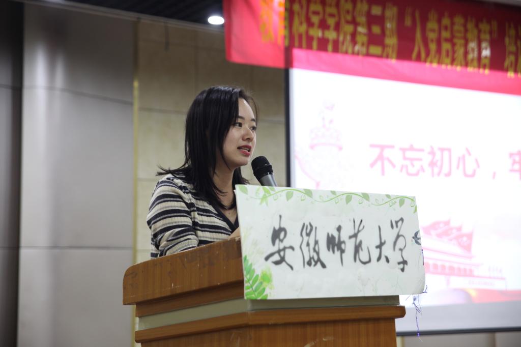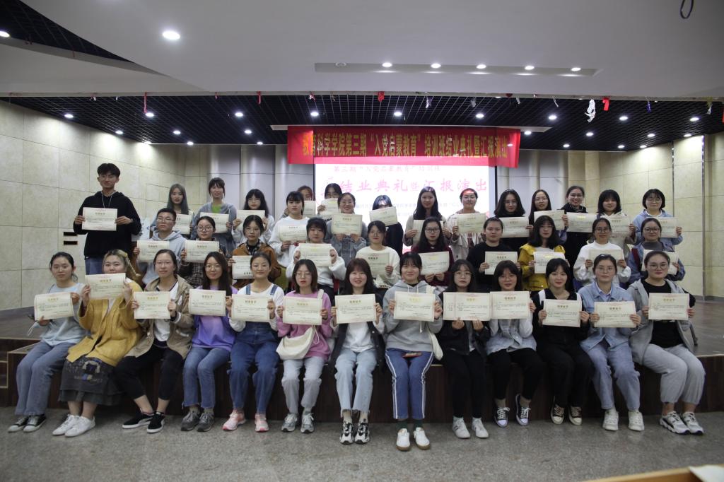 本网讯(教科院 孔倩)“往昔不悔,来日可期”。教育科学学院第三期“入党启蒙教育”培训班结业典礼暨汇报演出于10月26日晚7:00在团委多功能厅举行,蔡文老师、全体驻班党员、第三期启蒙班全体学员以及第四期启蒙班学员均参与了此次活动,活动由2019级入党积极分子徐文文同学主持。