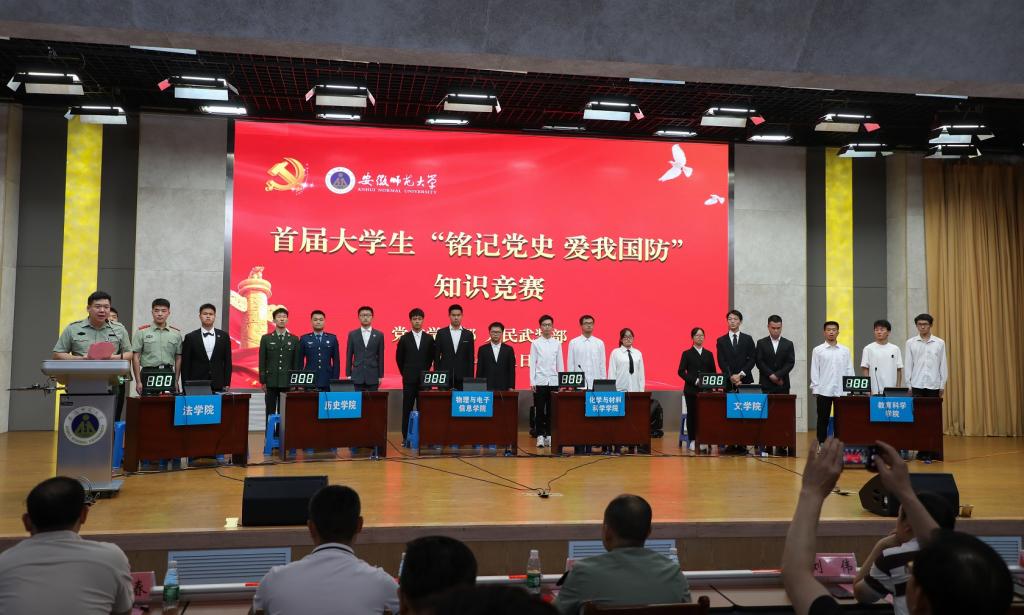 本网讯(教科院 杜安、蔡文)为庆祝中国共产党成立100周年,增强大学生国防观念和国家安全意识,“青春心向党奋进新征程”安徽师范大学首届大学生“铭记党史 爱我国防”知识竞赛决赛于6月11日晚在花津校区理科大楼报告厅举行。校党委常委、副校长陆林,学工部部长、学生处处长刘晓宇,宣传部副部长王峰出席活动并为获奖选手颁奖。晋级决赛学院的党委副书记以及师生代表200余人参加了活动,教科院共有四位同学参与此次比赛。