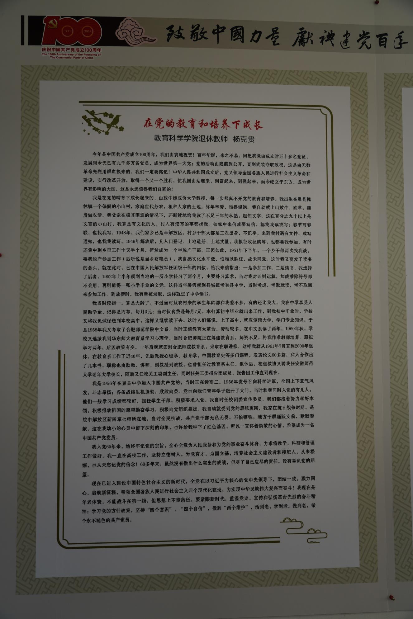 本网讯(院退教协 王守恒)在喜迎中国共产党成立100周年之际,由校离退休工作处和校退教协主办的“致敬中国力量,献礼建党百年”离退休教职工诗文、书画、摄影展日前顺利落下帷幕。此次展览活动是全校离退休教职工向中国共产党百年华诞献上的一份厚礼,活动开展以来,学院退休教工党支部、退教协分会在学院党委的领导和支持下积极组织退休教师参与此项活动,得到了老同志们的积极响应。本次展览全校共展出作品124篇(幅),其中教科院退休教师参展的作品15件,占所有参展作品的12%,不仅在参展单位中参展的作品数量最多、类型最全,包括杨克贵、刘楚明、王守恒老师的诗文作品5篇(首)、林若男、陈满堂老师的书画作品4幅、杨先海、庞世焕老师的摄影作品6幅。参展作品内容丰富、主题突出,或讴歌党的丰功伟绩特别是教育变革的光辉历程,或反映伟大祖国发展的精彩瞬间,或联系自身成长的过程感念党的培养教育之恩,用丹青妙笔表达对伟大祖国未来的期盼和衷心祝愿,凝聚着老同志对幸福生活的赞美,展现了老同志们奋斗不息、昂扬向上的精神风貌,受到展览组织者和广大观众的好评。
