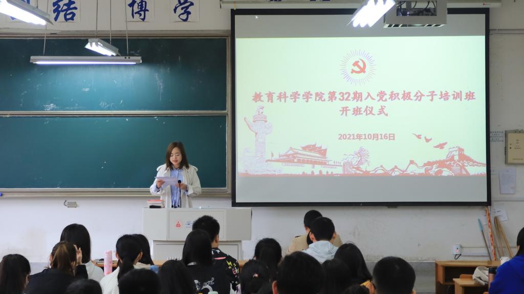 (本网讯 张天乐)为提升入党积极分子的政治理论水平,强化基本素养,把好党员“入口关”,确保党员发展质量,10月16日上午,教育科学学院第32期(校第62期)入党积极分子培训班开业典礼在田楼8101教室举行。院党委副书记杜凤、培训班班主任蔡文以及本期培训班全体学员出席本次典礼。