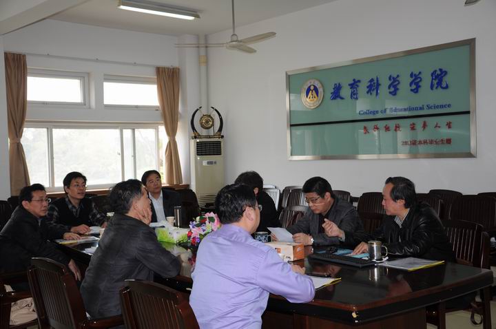 本网讯(教科院  柳丽娜)3月28日下午,来自省内六所高师院校教育科学学院的10余位专家齐聚在我校,围绕全省高师院校教师教育类专业改革与发展、学院之间的合作与交流等主题进行了深入的研讨。安庆师范学院教育学院院长曹长德教授,合肥师范学院教师教育学院院长吴秋芬教授,阜阳师范学院教育科学学院院长汪明教授,淮南师范学院教师教育中心主任陈雍茹教授,淮北师范大学图书馆馆长王家云教授、教育学院副院长李怀龙教授和教育科学学院院长葛明贵教授、副院长桑青松教授、副院长阮成武教授、院教授委员会主任周兴国教授等参加了会议。会议在教科院会议室举行,由葛明贵主持。