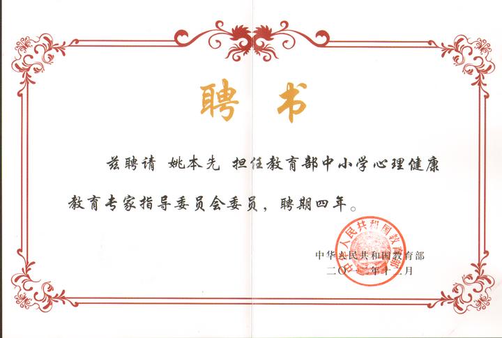 会上颁布了“教育部关于印发《中小学心理健康教育指导纲要(2012年修订)的通知(教基一[2012]15号)”、“教育部办公厅关于公布首批全国中小学心理健康教育示范区名单的通知(教基一厅[2012]62号)”和“教育部办公厅关于调整中小学心理健康教育专家指导委员会委员的通知(教基一厅函[2012]59号)”等三份文件。我院姚本先教授被聘为新一届中小学心理健康教育专家指导委员会委员。教育部副部长刘利民在发言中就深入开展中小学心理健康教育作了重要讲话,并亲自为新一届中小学心理健康教育专家指导委员会的委员颁发聘书。(柳丽娜)