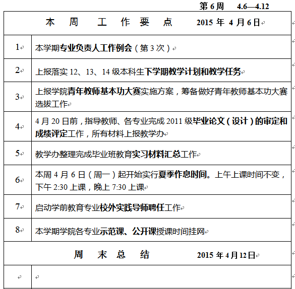 教育科学学院2014-2015学年第二学期教学工作第6周周报表