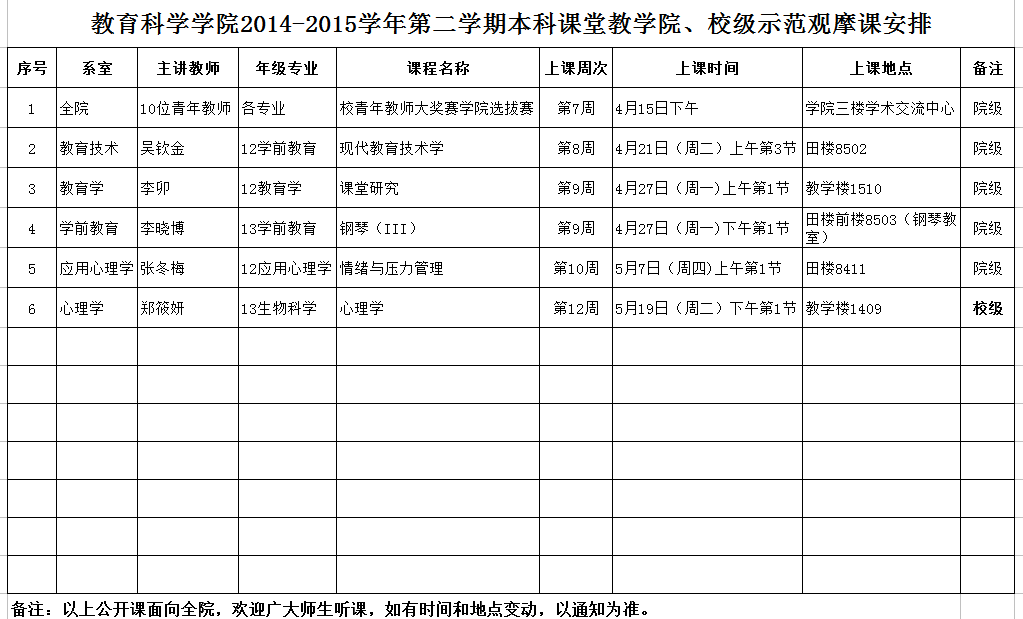 教育科学学院2014-2015学年第二学期本科课堂教学院、校级示范观摩课安排