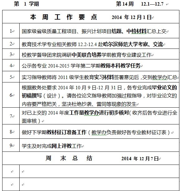 教育科学学院2014-2015学年第一学期教学工作第14周周报表