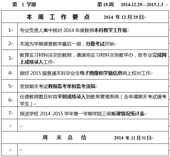 教育科学学院2014-2015学年第一学期教学工作第18周周报表
