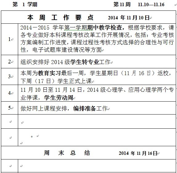 教育科学学院2014-2015学年第一学期教学工作第11周周报表
