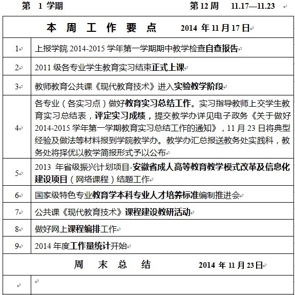 教育科学学院2014-2015学年第一学期教学工作第12周周报表