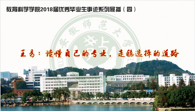 在安徽师范大学和美国布莱诺大学度过的学习生活中,王易四年如一日的严格要求自己,坚持不懈地提升自身综合素质。这四年的历练,她经历了太多的困苦和曲折。但是她获得的成绩告诉我们,一份耕耘一分收获,越努力,越幸运。